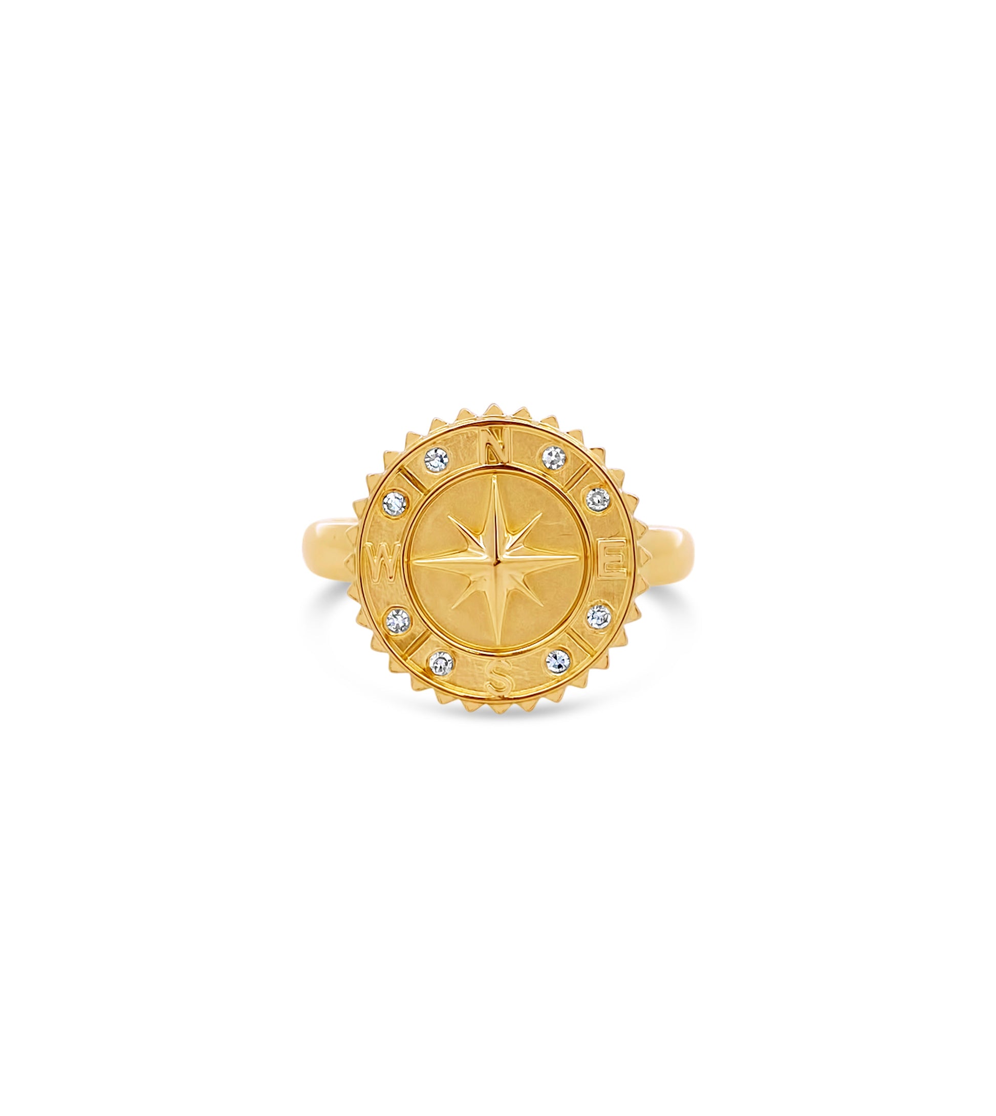 This stunning Diamond Compass Medallion Ring brings direction and sophistication to any outfit. Crafted with a dazzling 14k gold satin finish, the stylish compass disc ring will add a timeless touch to your wardrobe. Look and feel your best with this elegant and meaningful accessory.