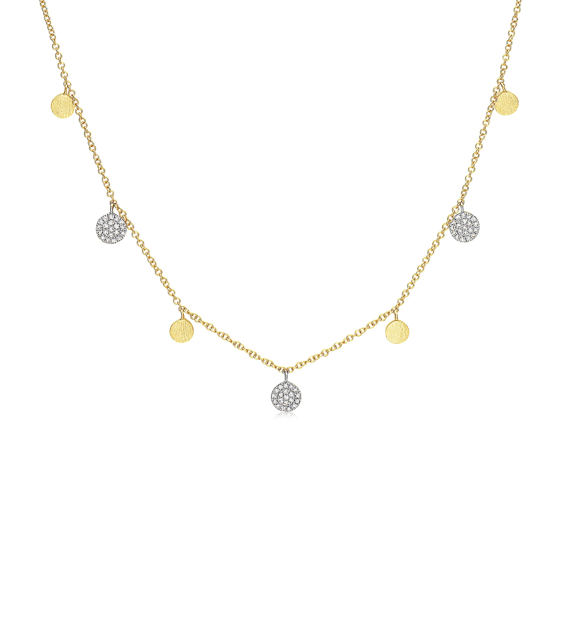 This elegant 14K gold necklace is adorned with diamond and gold disc charms, and offers an adjustable chain length of 18 to 16 inches. The perfect accessory for any outfit, its delicate design is sure to make you stand out in the crowd.