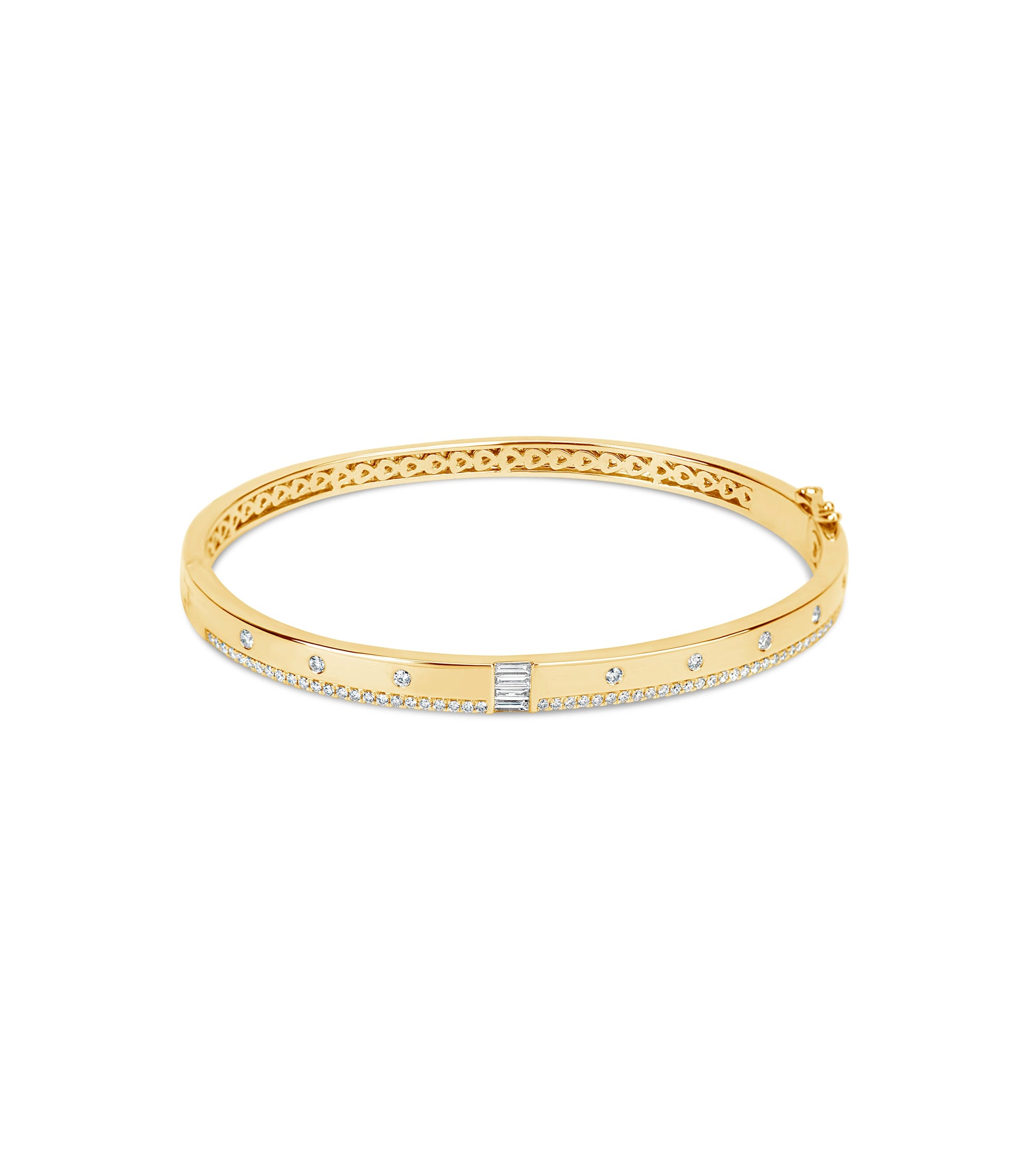 Slay the night in this dazzling Diamond Dot Bangle! Crafted of 14k yellow gold, this bangle sparkles with round and baguette diamonds. Flaunt your flair for the finer things with this perfect fit for a size 7 wrist!