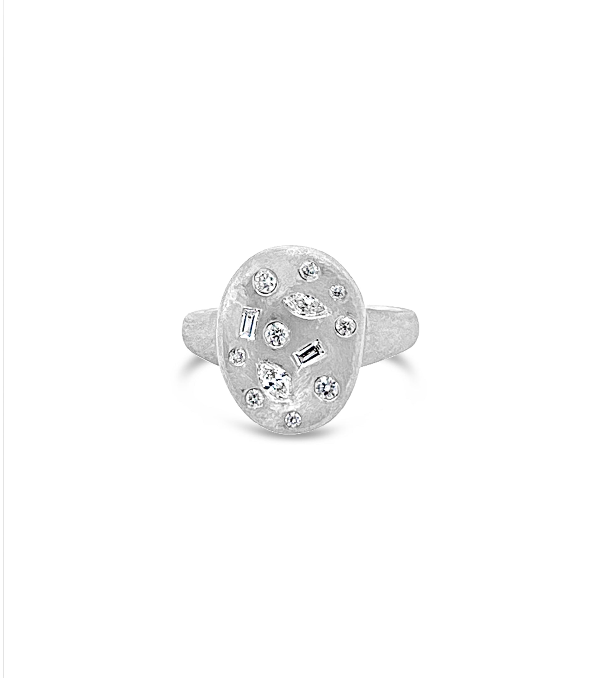 Enhance your style with our Mix Diamond Celestial Concave Ring. Made with premium 14k gold brushed finish, this free form ring features scattered fancy shape diamonds for a unique and elegant look. Elevate any outfit and make a statement with this exquisite ring.