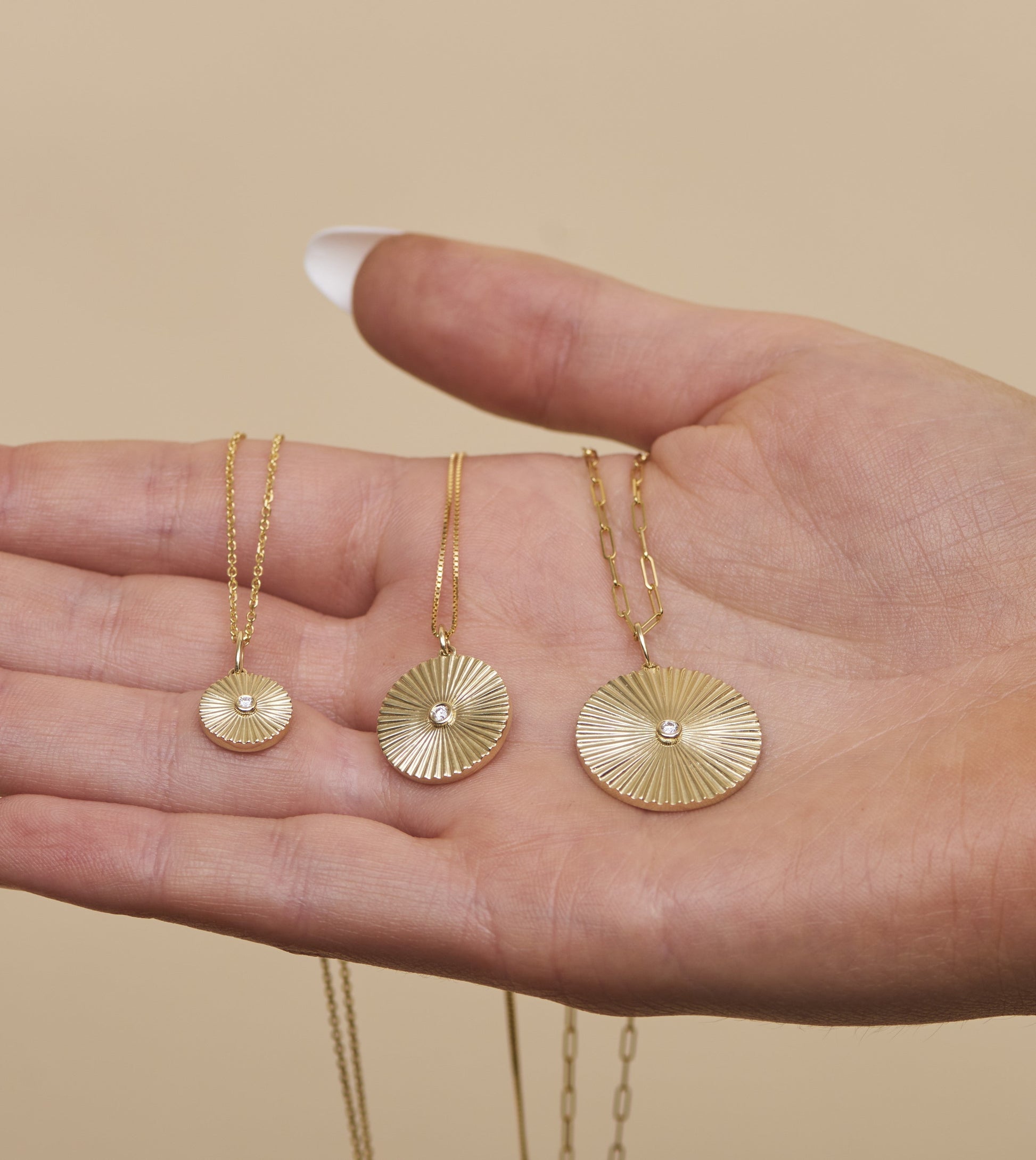 Adorn your neck in style with this beautiful Diamond Fluted Medallion Necklace. Crafted in solid 14k gold, it features a bezel diamond. The fluted ray necklace is an modern touch to the classic disc charm pendant that will shine with every move you make. Perfect for adding a touch of luxury to your look!