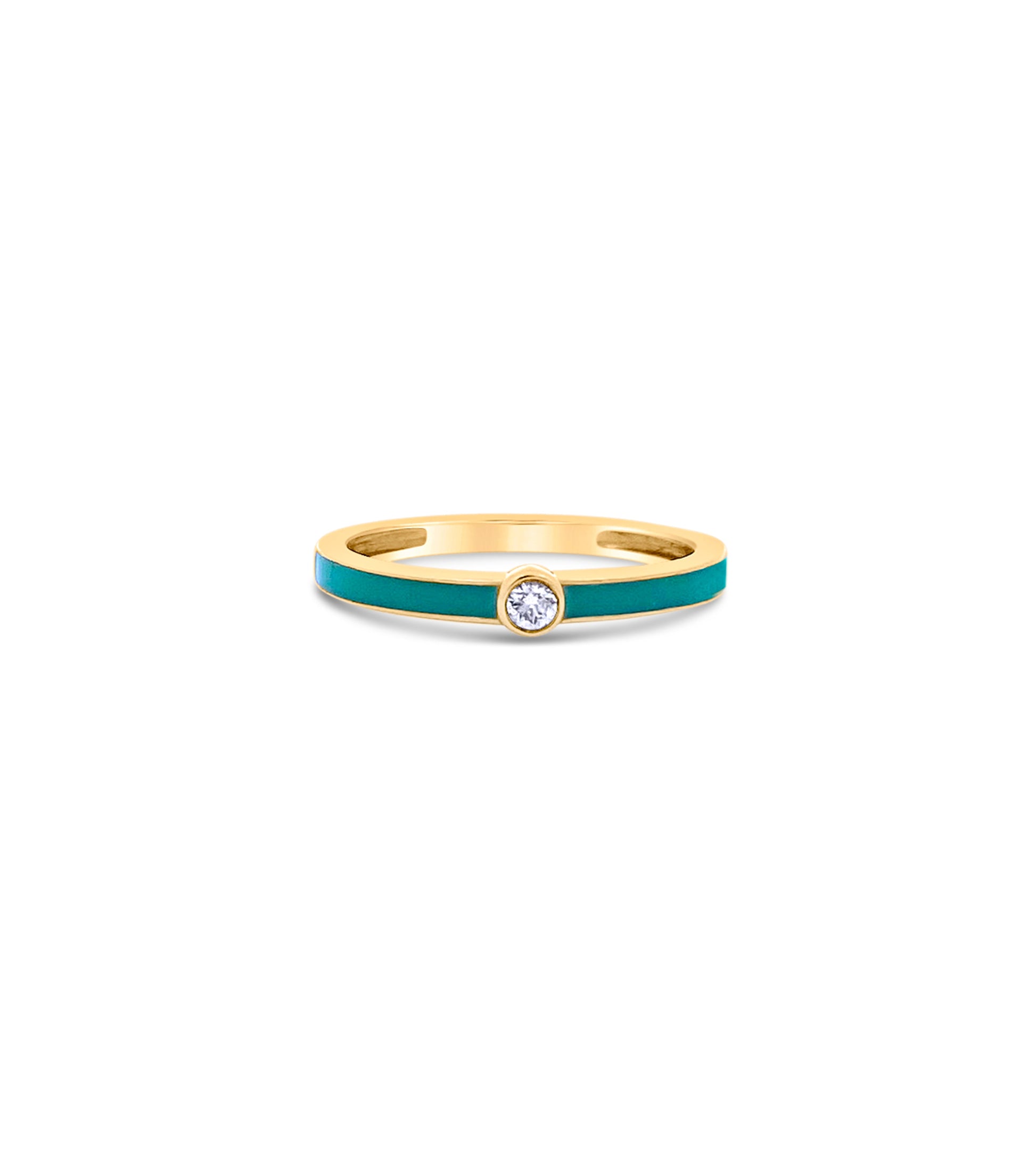 This stunning ring features 14k yellow gold, a bezel set diamond, and a bold green enamel band for added glamour. Add a touch of elegance to any outfit and make a statement with this bold and beautiful diamond red enamel ring!