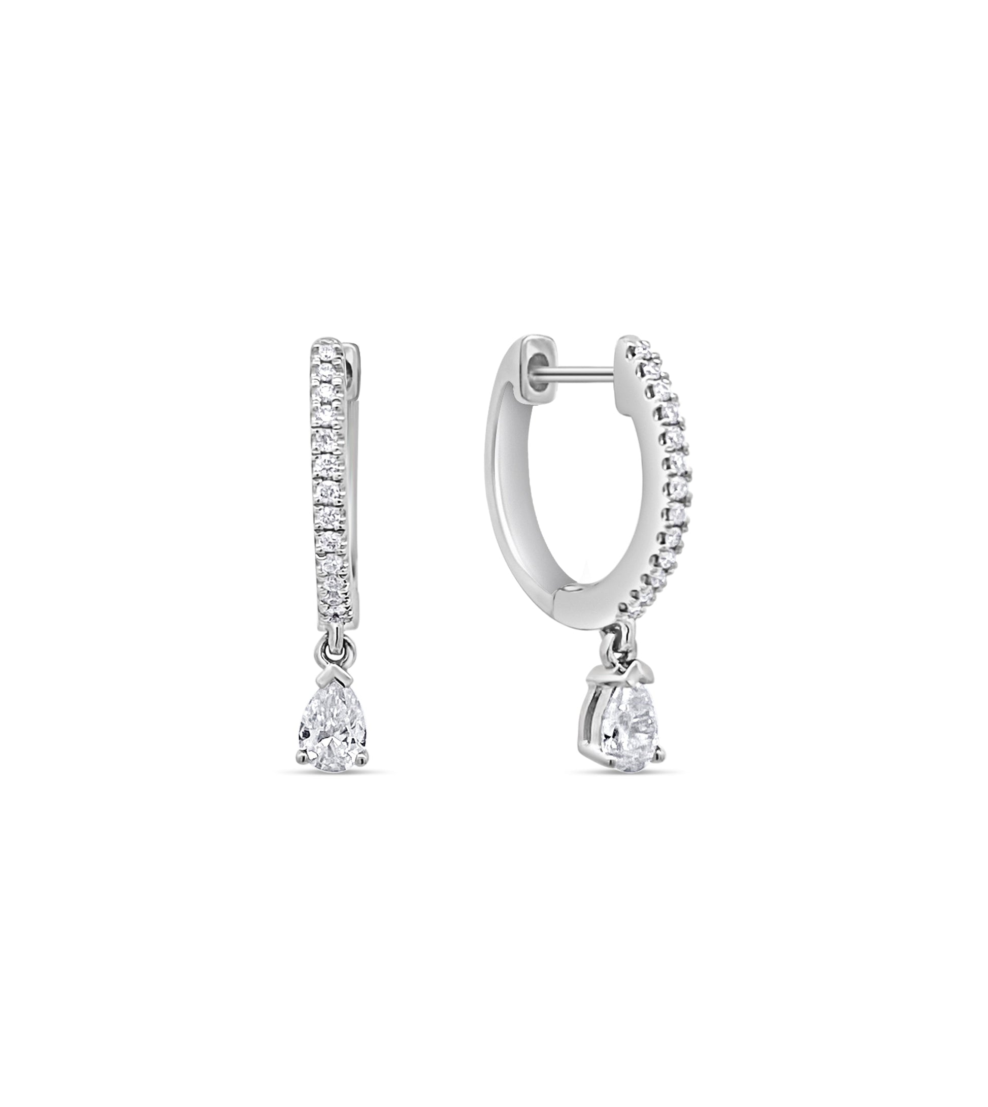 This stunning Diamond Pear Dangle Huggie Earring is crafted in luxurious 14k white gold, featuring an elegant pear shape diamond dangle. With an additional hole for one side of the earring, it offers eye-catching sparkle and incomparable style.