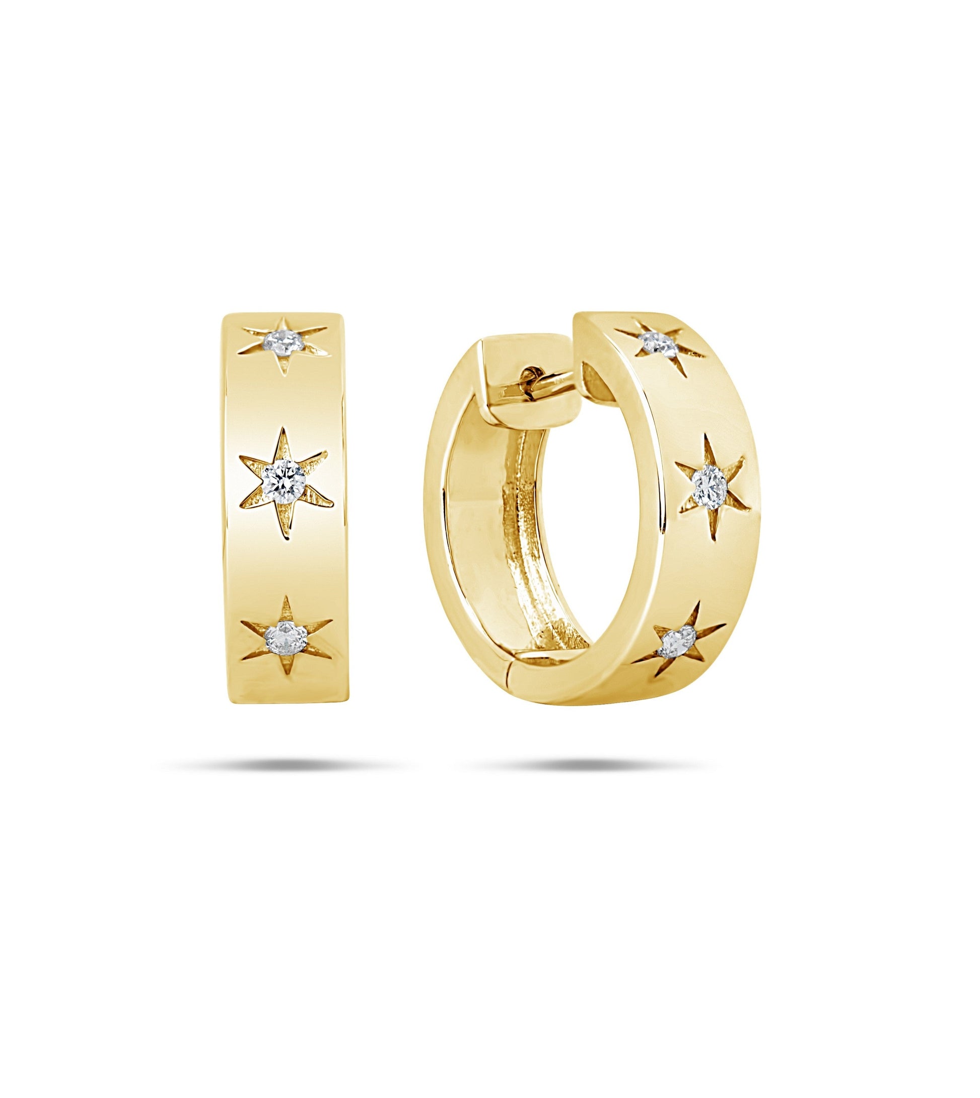 Express your sparkle with these gorgeous Diamond Star Set Hoop Earrings. Crafted from 14k yellow gold, the huggie style is set with shimmering star setting around round diamonds for a timeless look that will light up your look. Let your beauty shine!