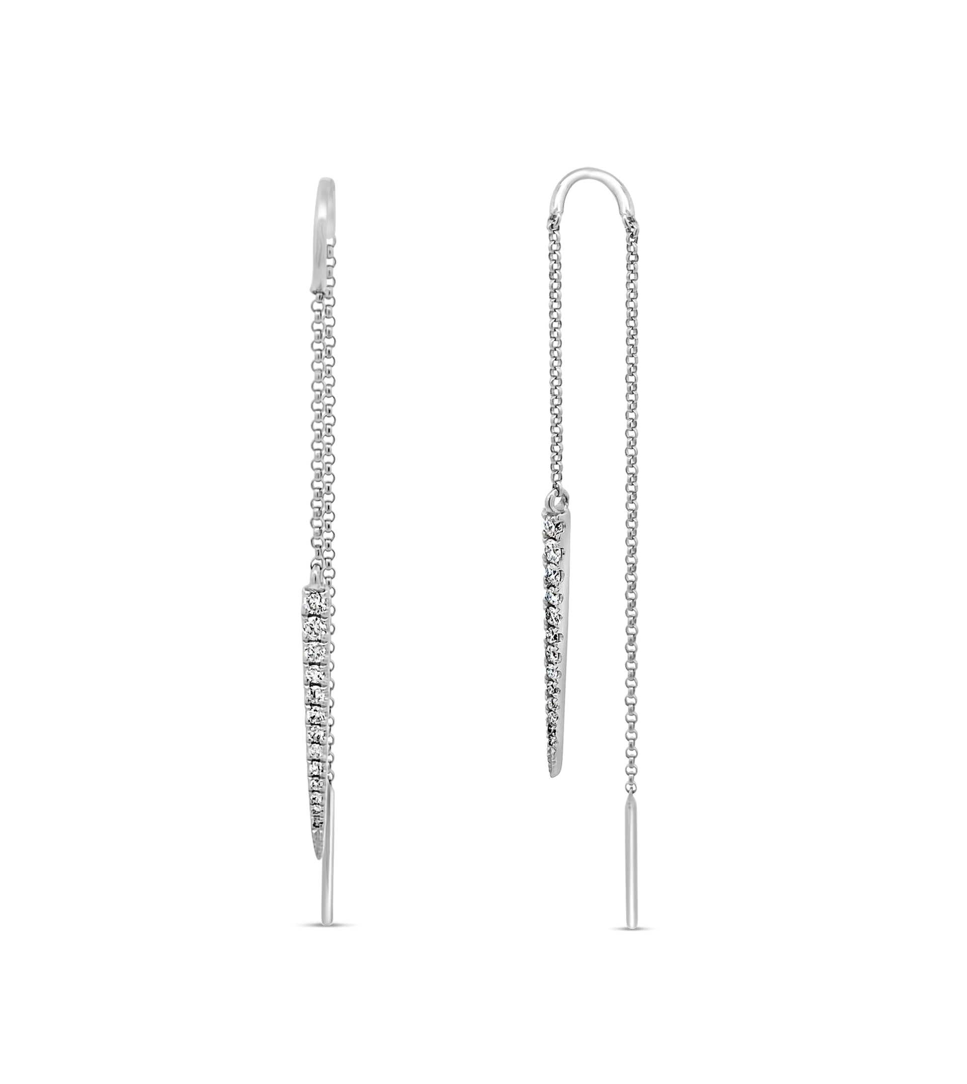 These Diamond Threader Earrings are the perfect addition to any outfit. Crafted from 14K white gold, they feature a diamond dagger and chain threader that adds an elegant sparkle and charm. Enhance your daily look with these beautiful earrings today!