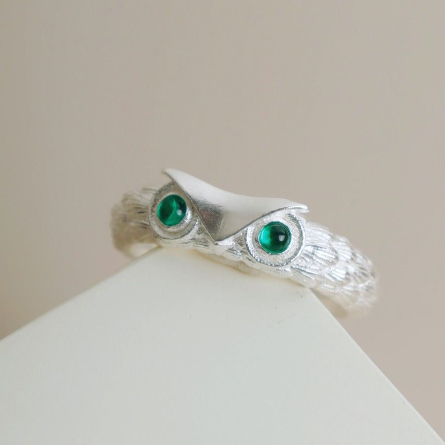 Adorable Dr. Owl Emerald Eye Band 18K Yellow Gold Engagement Open Ring.