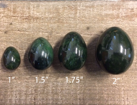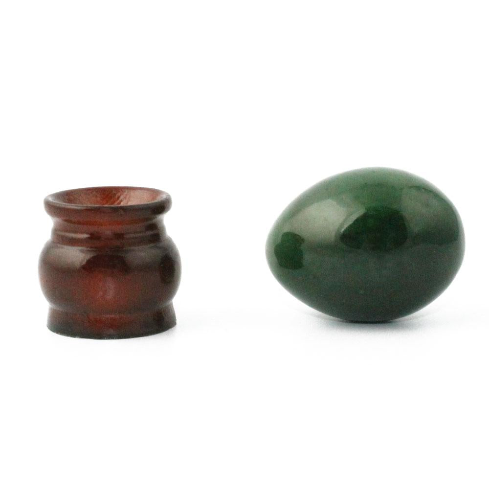 A polished Canadian Nephrite jade egg, a symbol of life and fertility, on a special desk base.