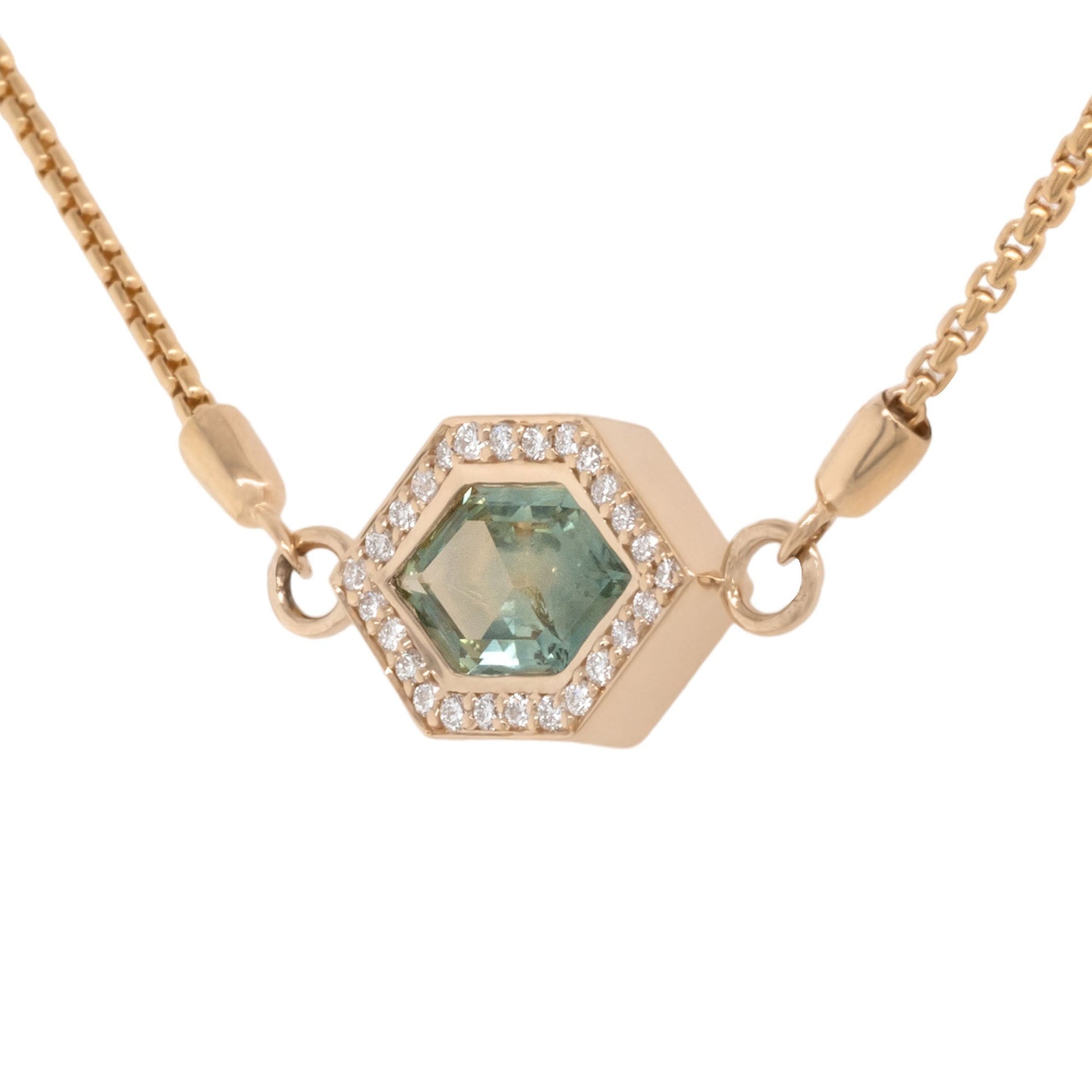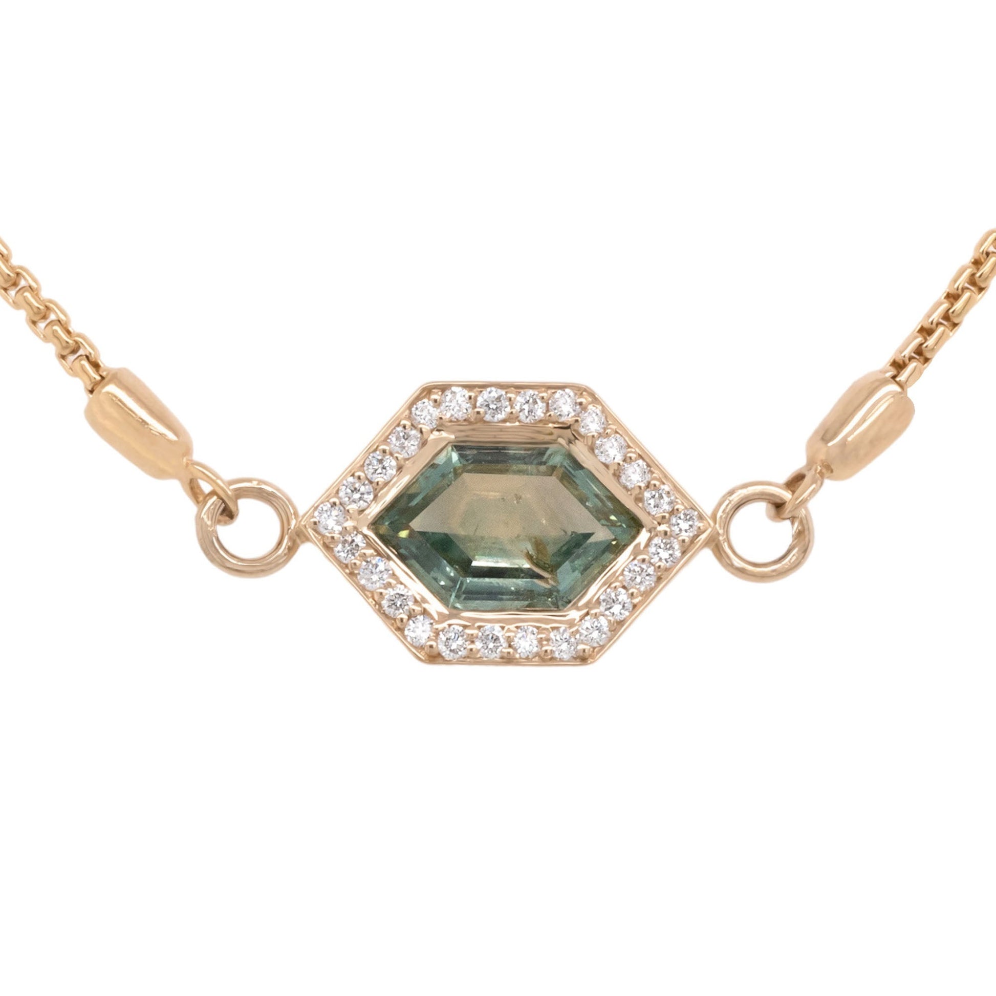 This bolo style bracelet is luxurious, dependable, and easy to wear. Perfect for a range of wrist sizes, this piece can give an outfit that extra flair. The aqua colored Montana sapphire is surrounded by a thick bezel of gold featuring pavé set white diamonds.