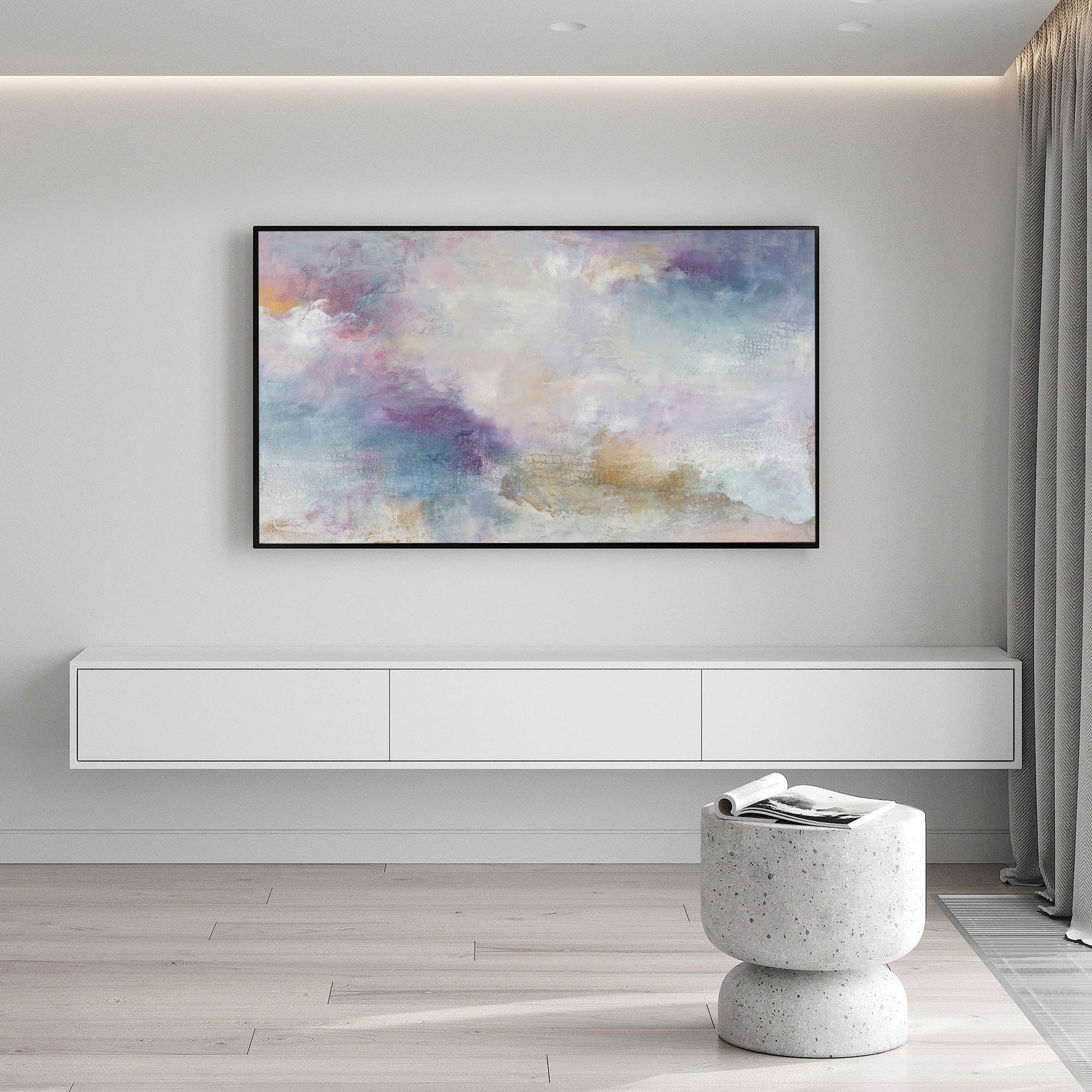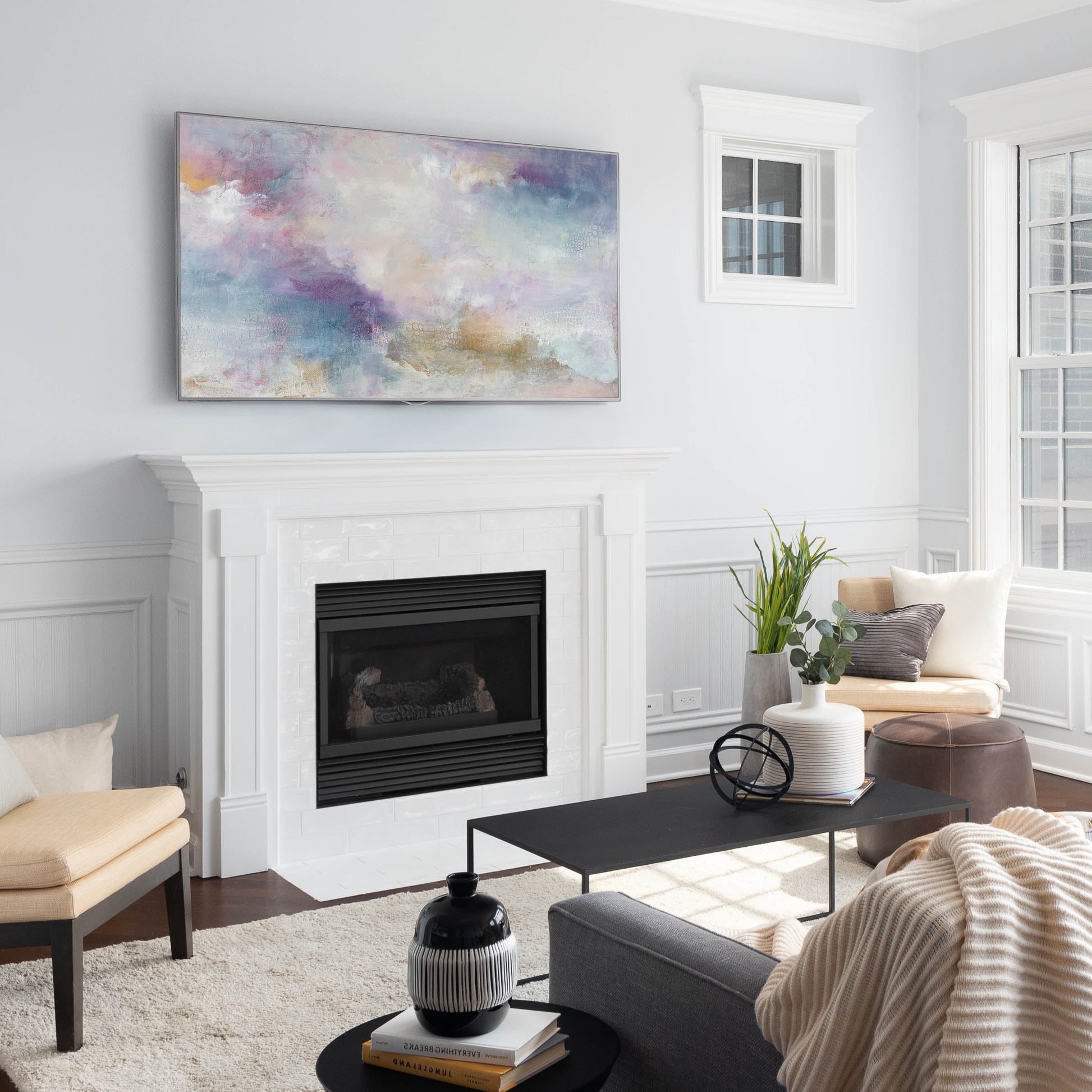 This soft abstract is full of neutral tones accented with pops of rich jewel tones, shifting the viewer’s eye around the composition.
