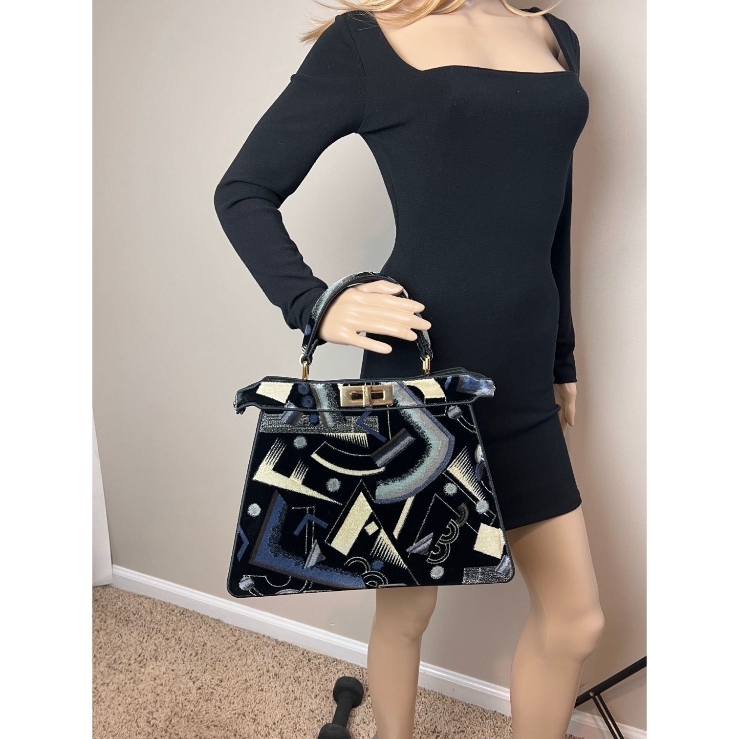 Fendi Peekaboo I see u Medium Printed Velvet Black Blue Satchel Shoulder Bag
