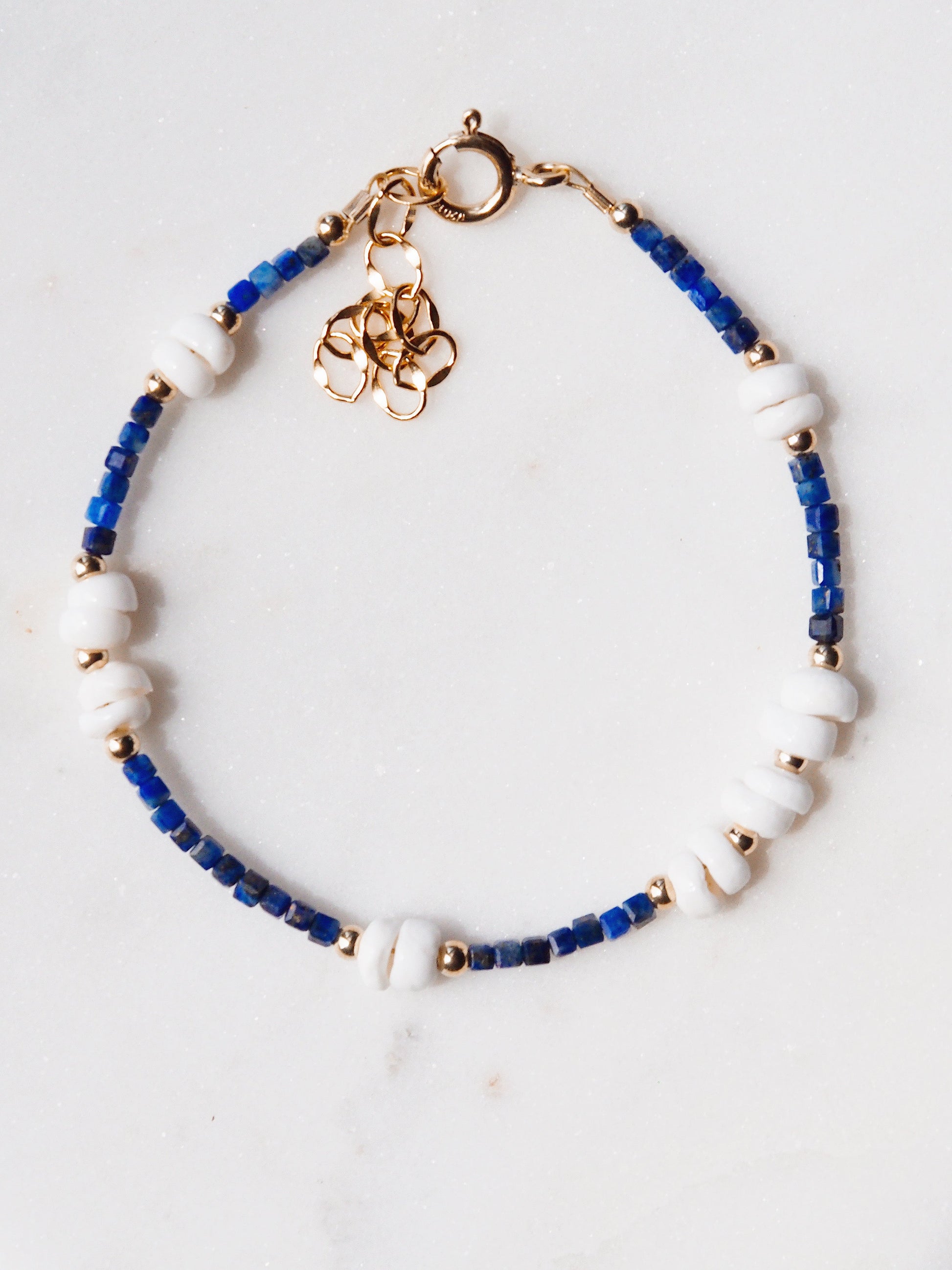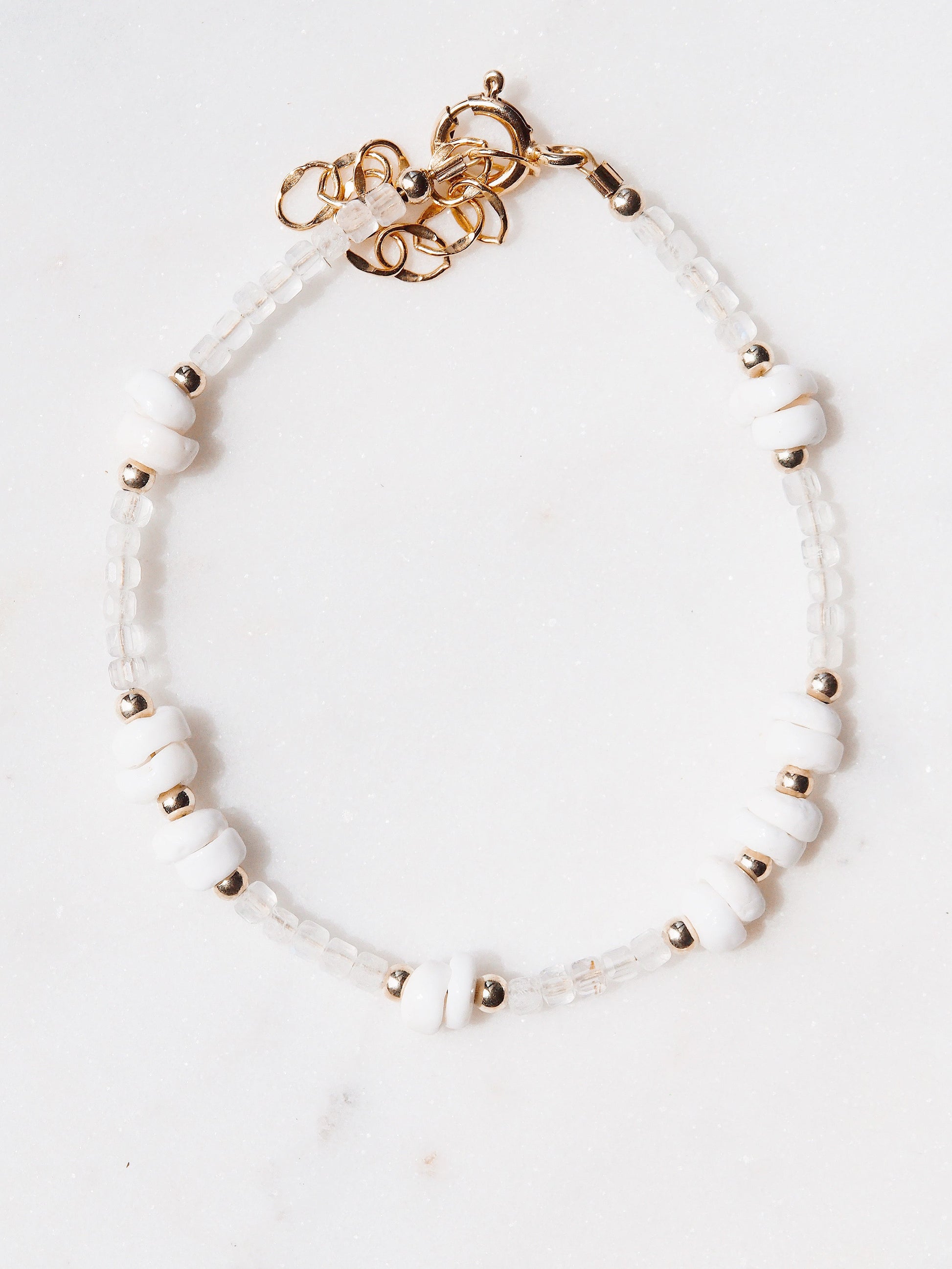 Dotted with natural white puka shells, shimmering gemstones, and golden beads, each of these luxe puka shell gemstone bracelets are one of kind. Each exquisite piece captures the essence of paradise, reminiscent of sun-kissed beaches and gentle ocean breezes.
