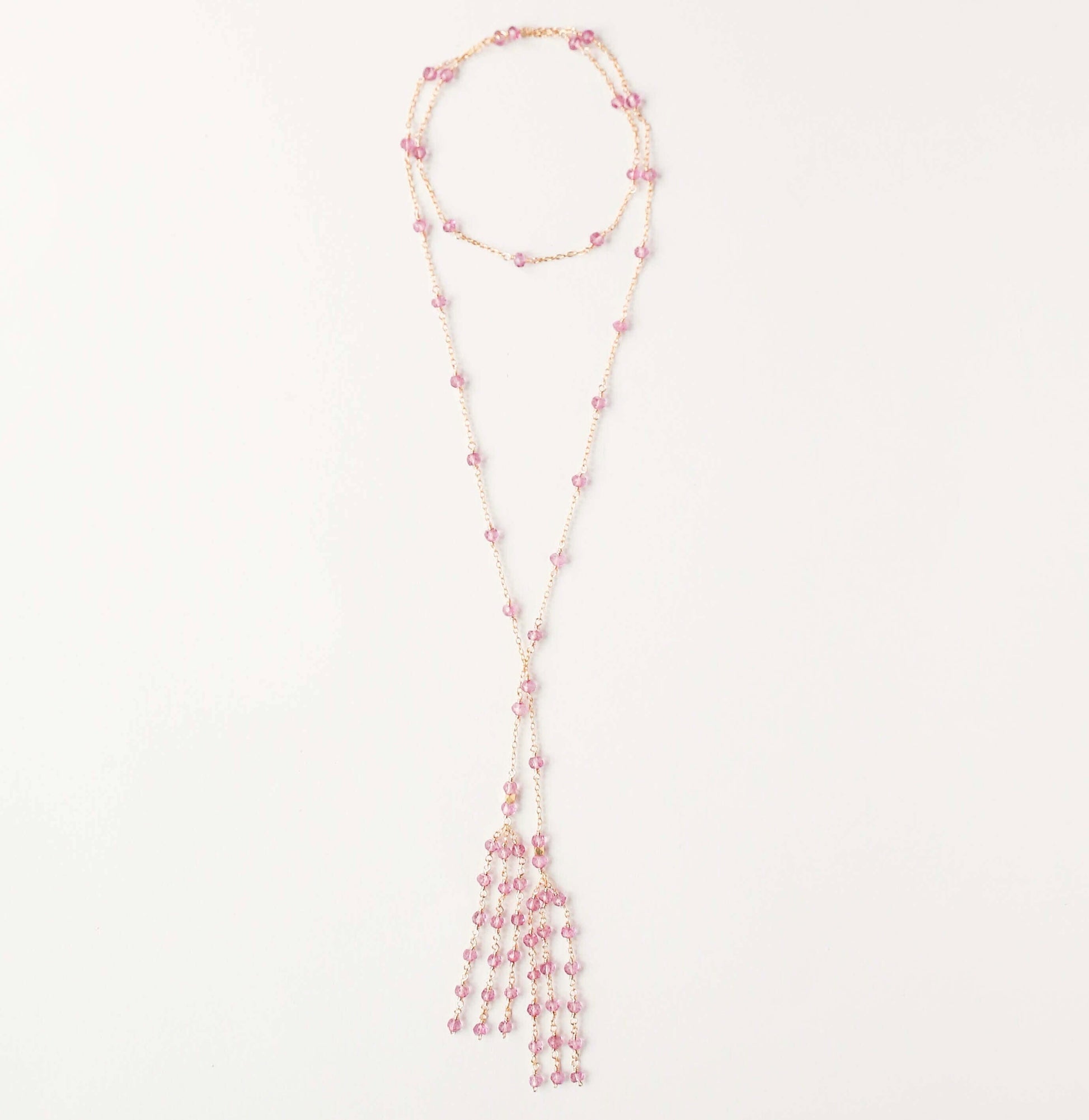 Delicate lariat necklace made with pink tourmaline gemstones and finished off with a beautiful tassel design. Designed as a shorter lariat so it falls mid-chest.