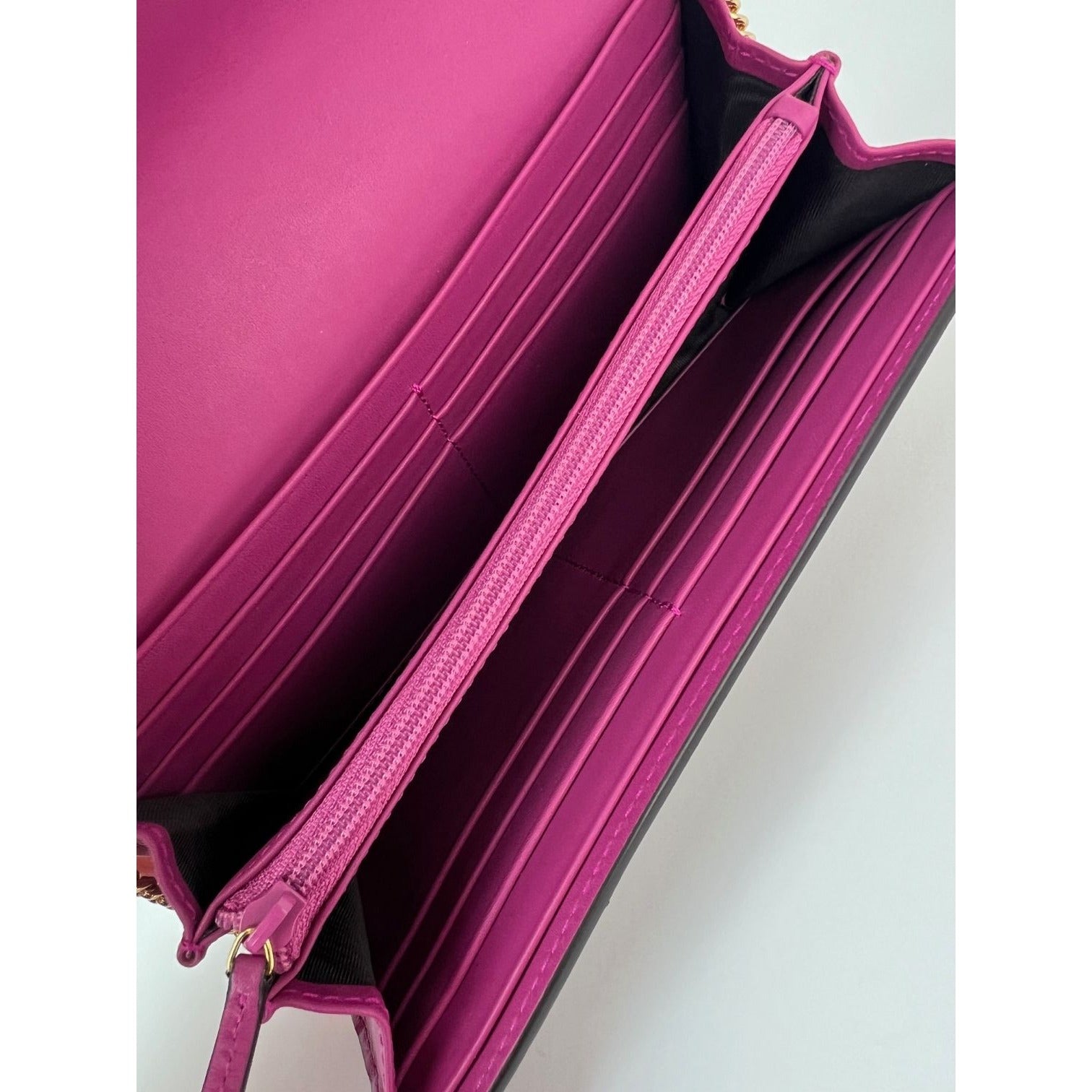 INTERIOR: pink leather and brown canvas, 12 credit card slots