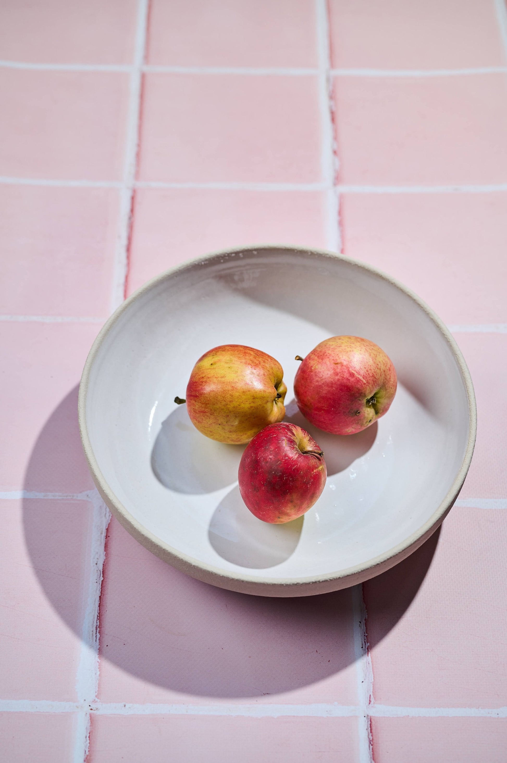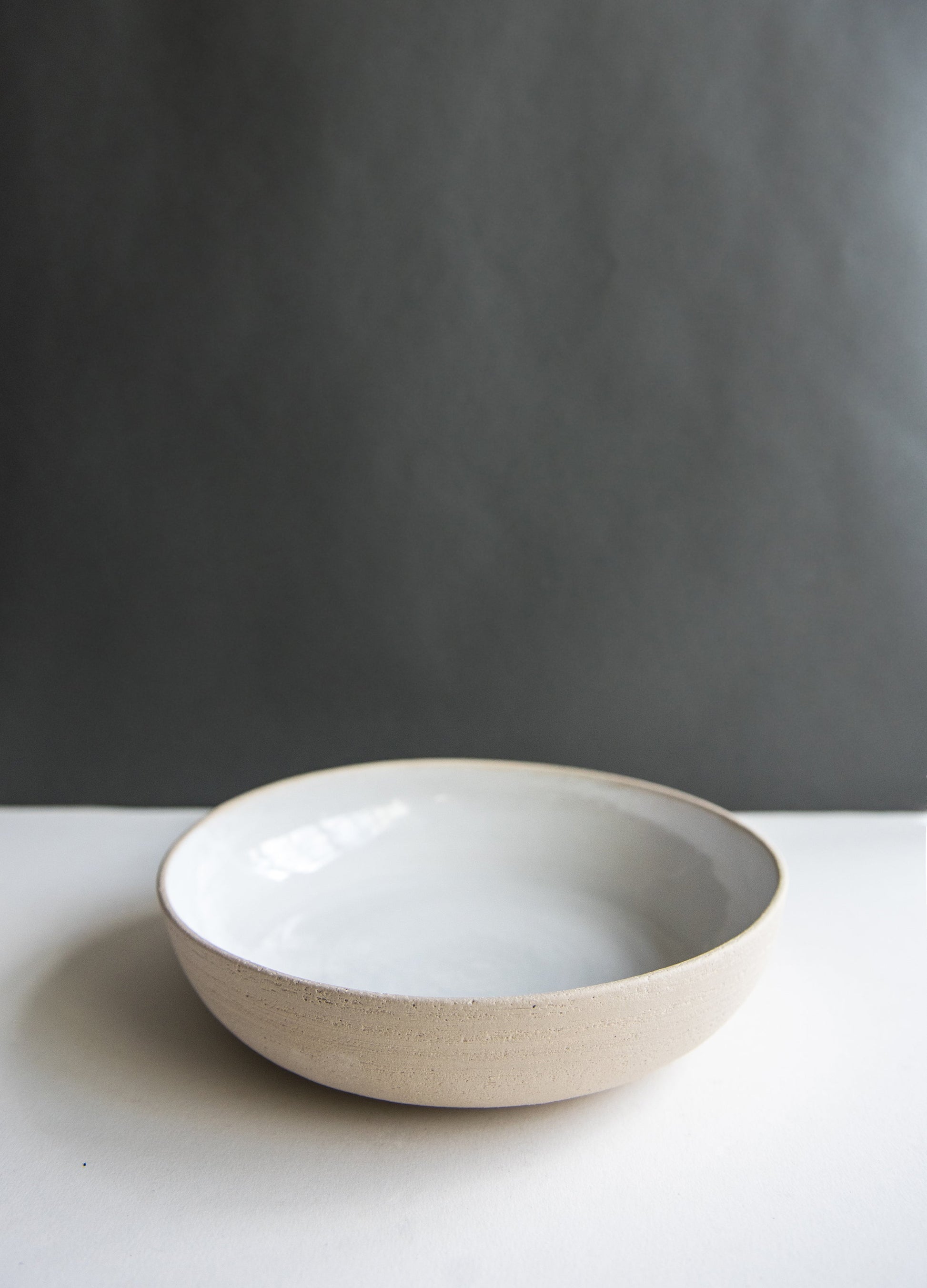 This is the most honest ceramic ware we have ever produced - exposed rough stoneware shows occasional signs of the artisans' fingers that were left during the hand-throwing process. The sides were smoothed but one can still see stoneware pores as if the dinnerware is breathing. The inside is covered with opaque white glaze for convenient use. This pasta bowl is perfect for serving pasta, salads, and main dishes to your table and sharing a wonderful meal with your beloved ones.