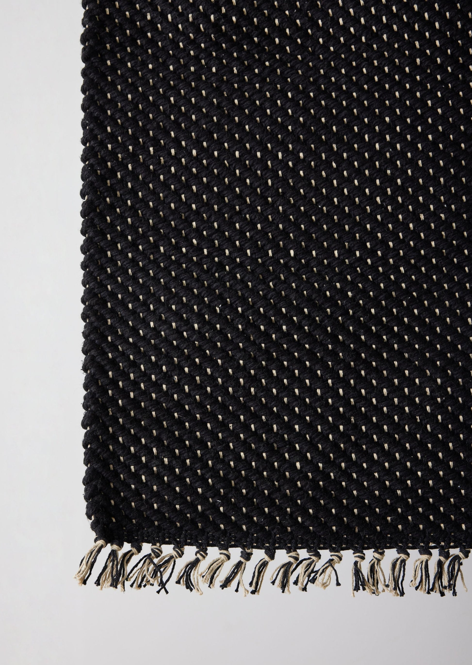 Handwoven in black onto a black and taupe backdrop, the pattern creates an alluring texture. Its thicker profile sets it apart, making it ideal not only as a bath mat or bedside rug but also as a stylish addition in various spaces around your home. Embrace the texture and sophistication this herringbone patterned rug brings to your décor. Scan the Q-code on the tags to see the artisan weaver who created your specific piece.