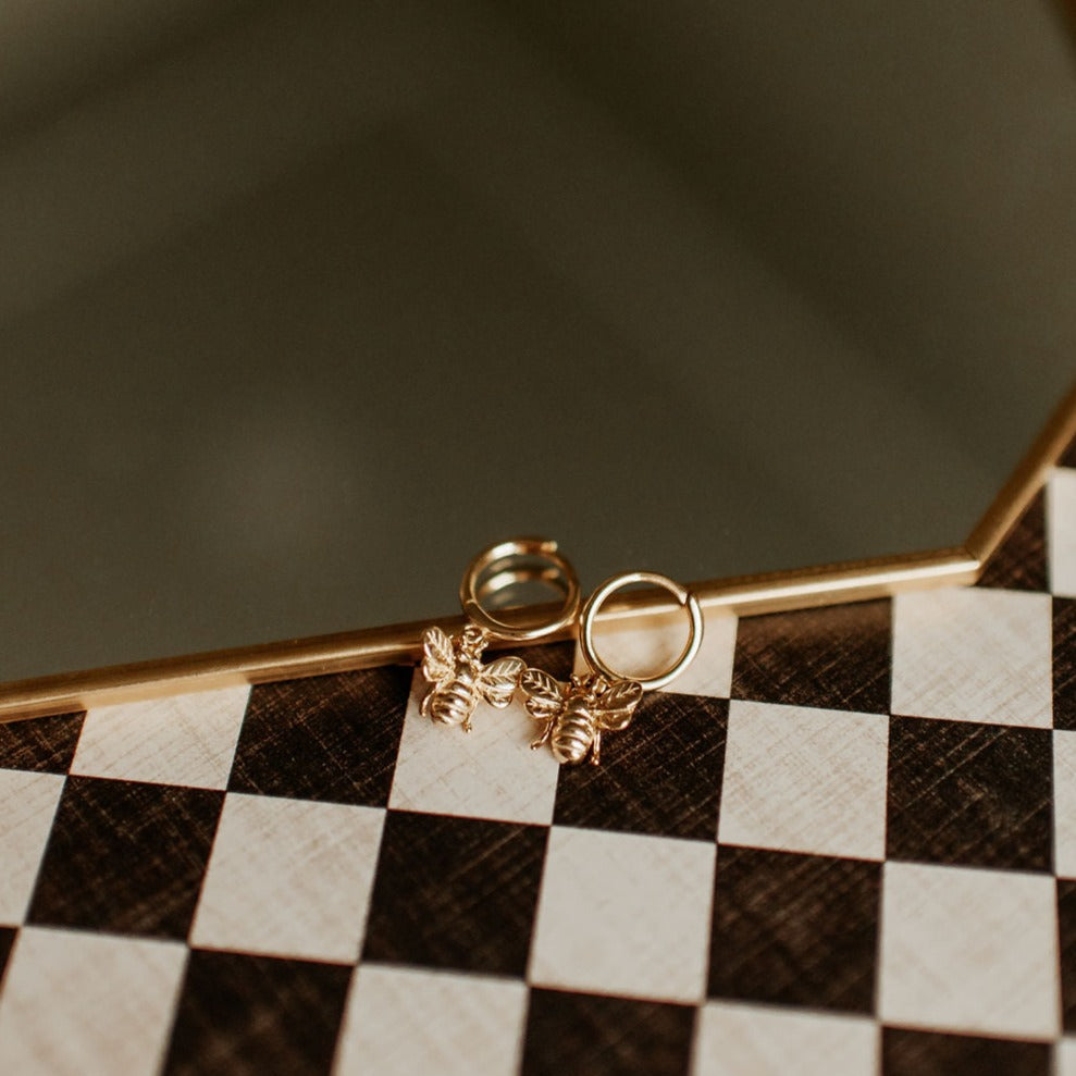 Dainty gold Honey Bee Hoop huggies. High quality gold vermeil (gold plated sterling silver). Hypoallergenic and good for sensitive skin.