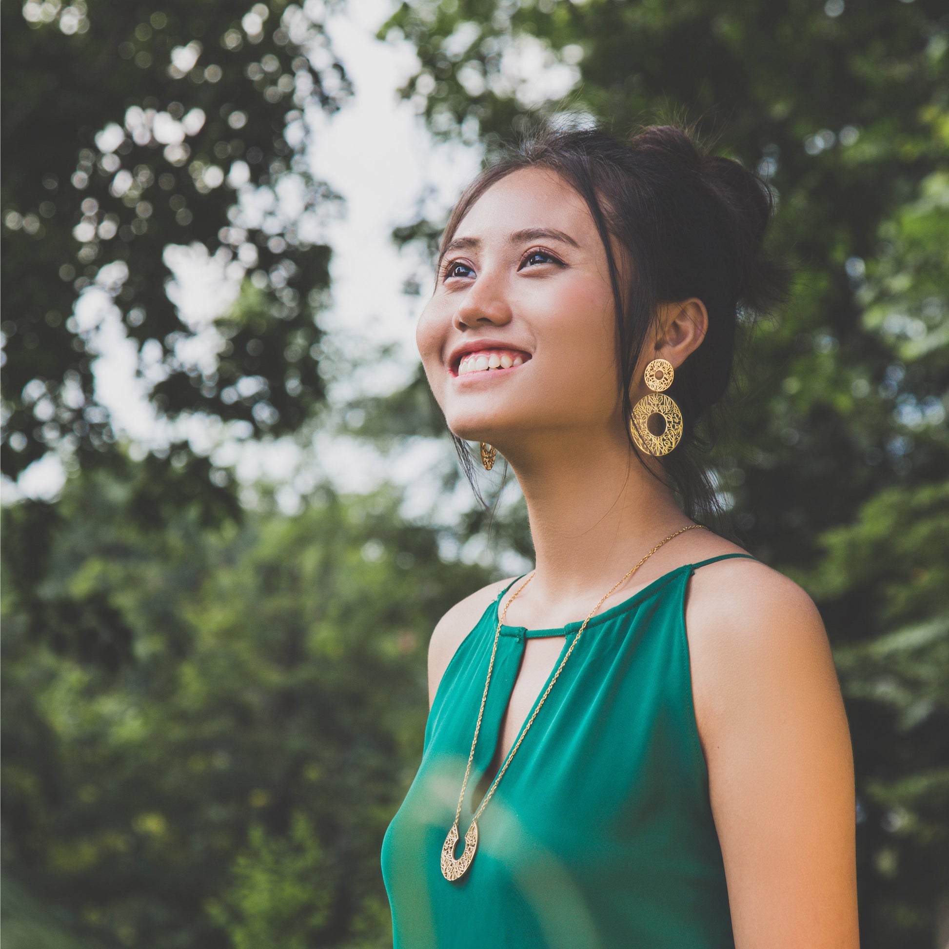 18K gold-plated stainless steel 1.6" pendant engraved with "I am brave" in Burmese with 0.8" pendant on 18K gold-plated sterling silver posts. 2.4" in length. #E319G.
