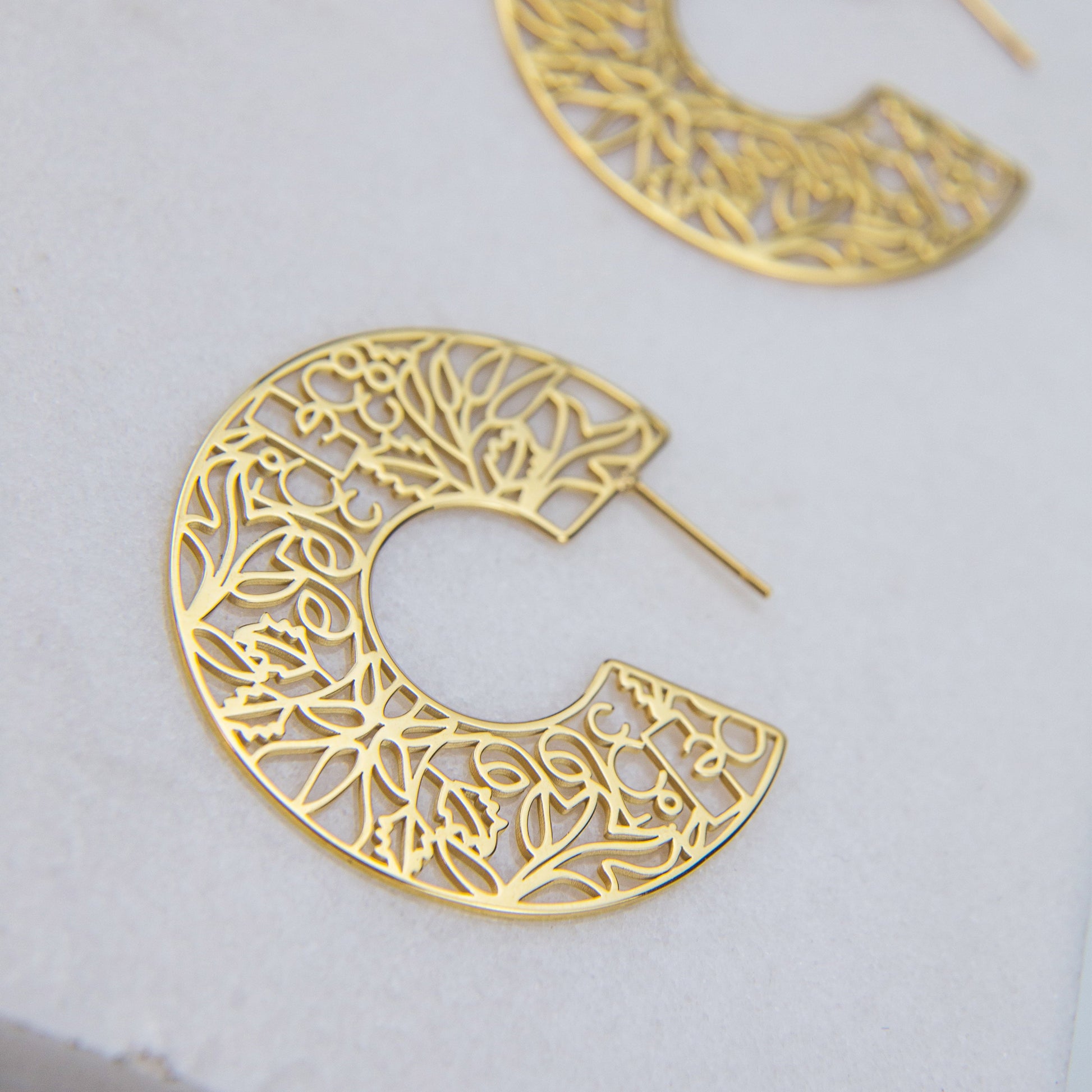 18K gold-plated stainless steel or stainless steel 1.6" disc hoops engraved with "I am brave" in Burmese on 18K gold-plated sterling silver or sterling silver posts. #318D & #E318G.