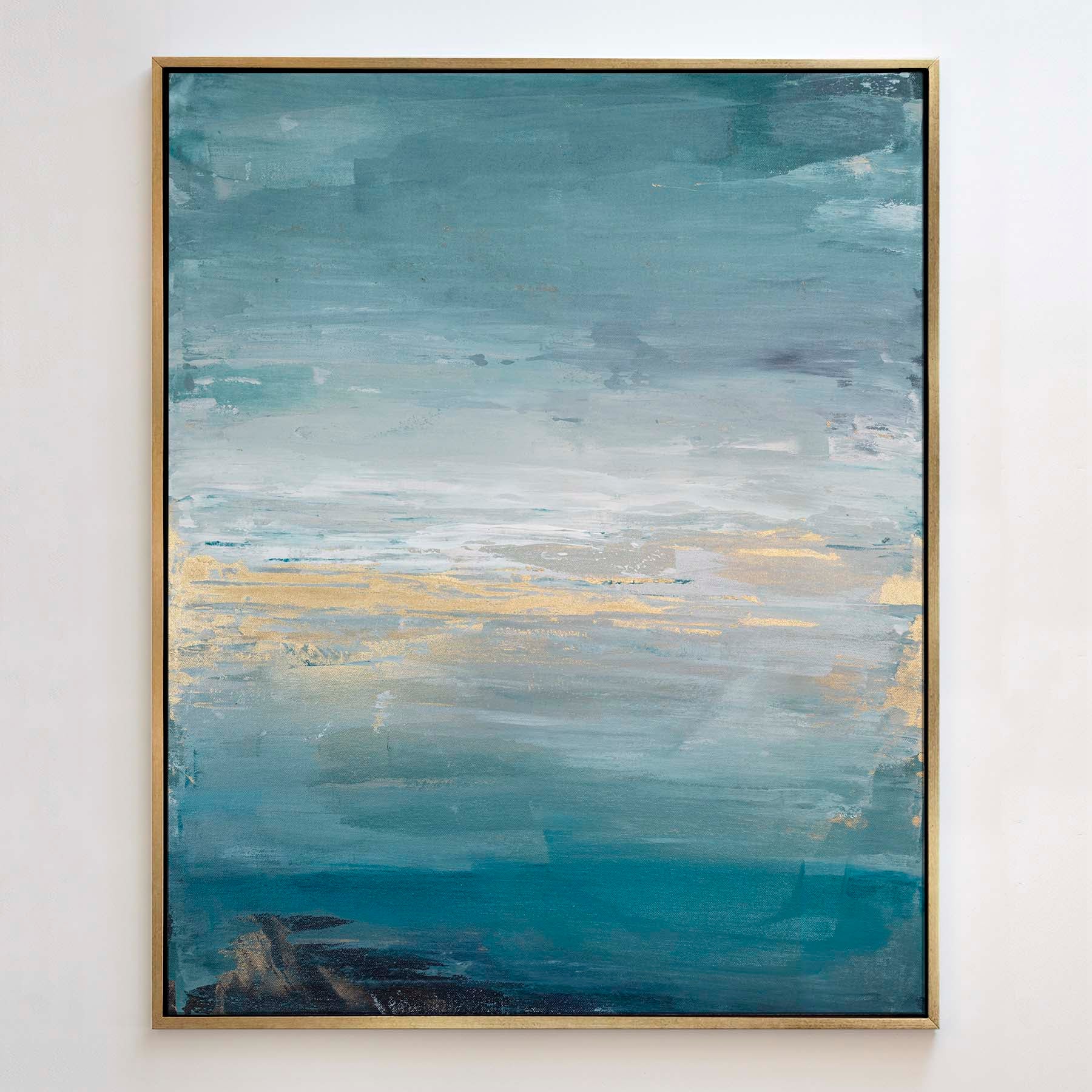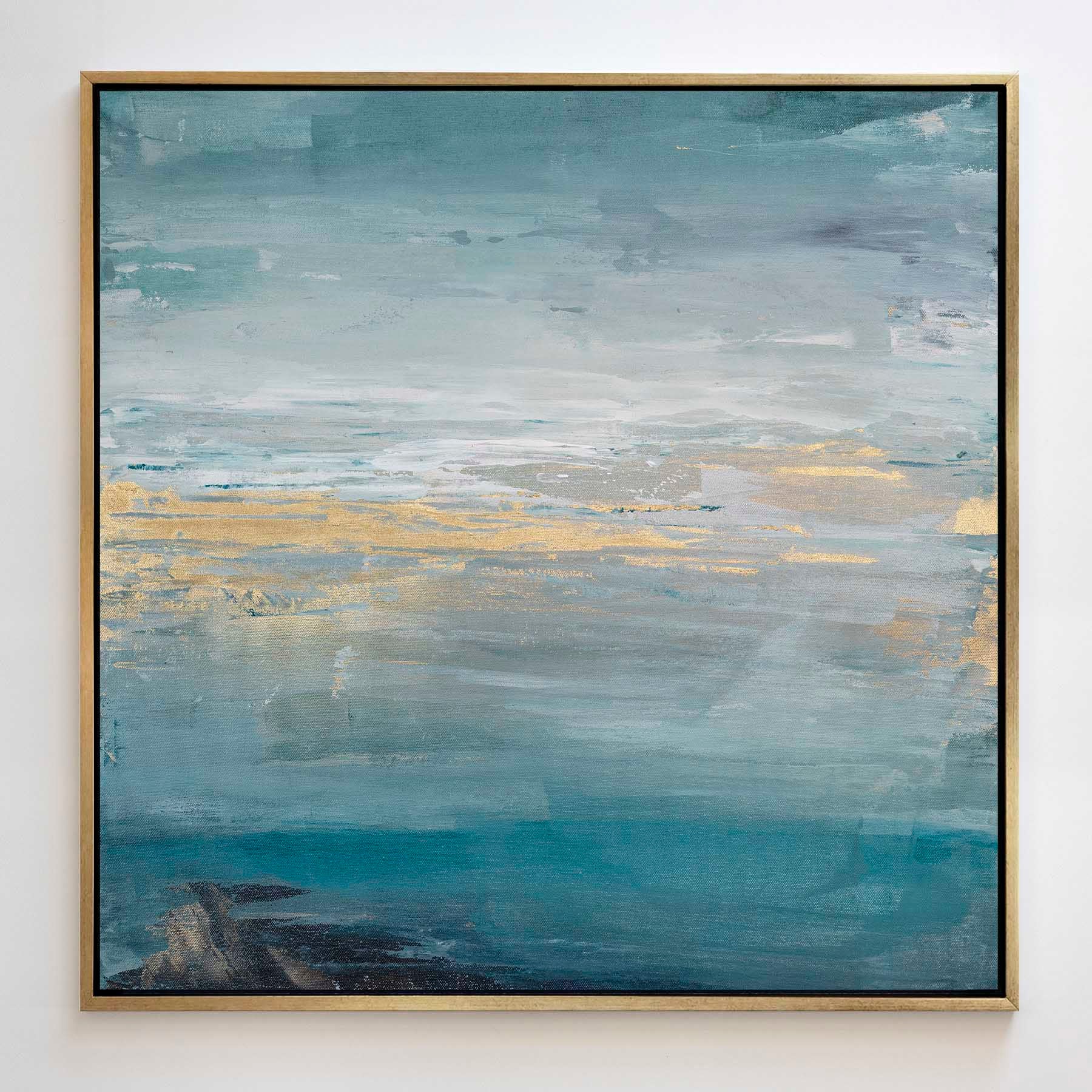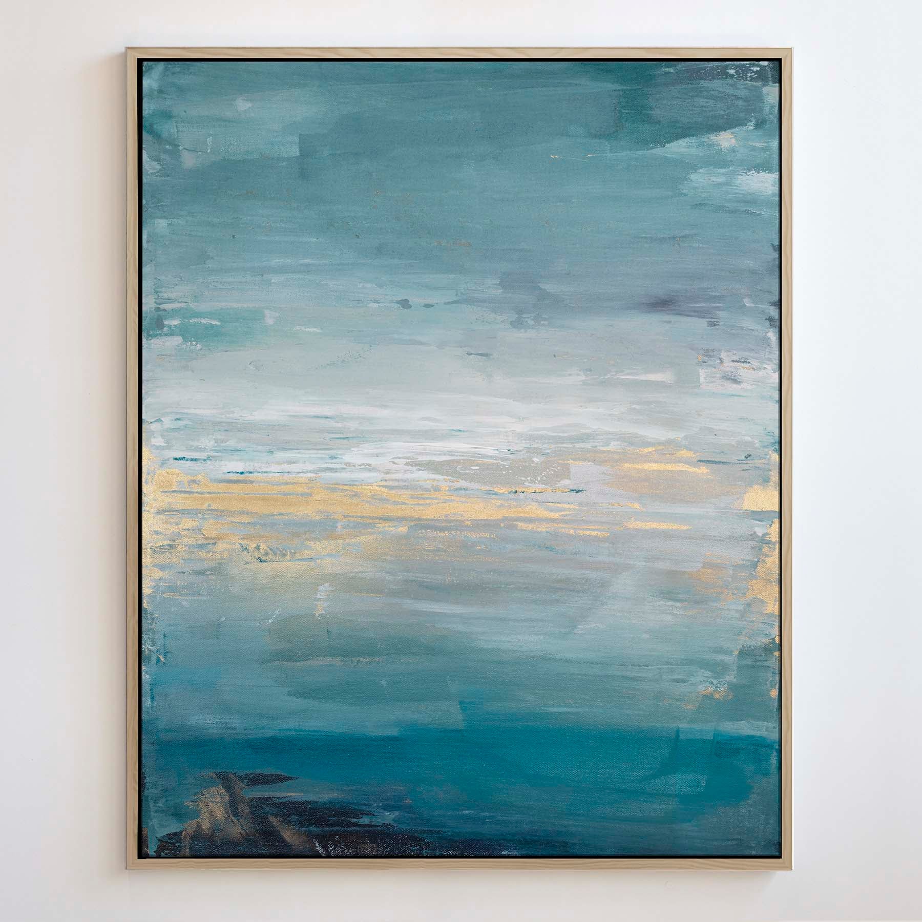 A coastal palette of teals, blues, soft white and gold delivers a rich feel to this canvas print.