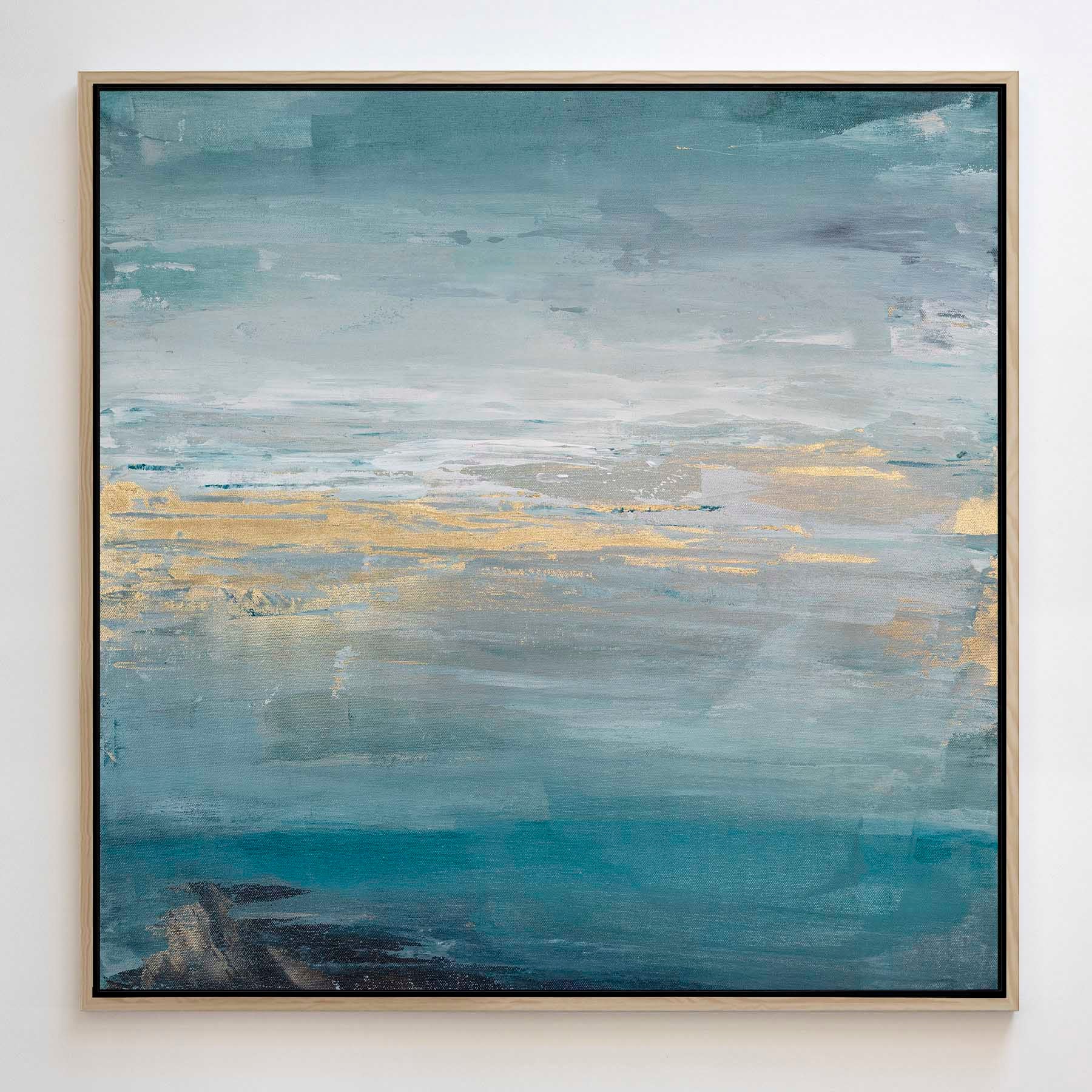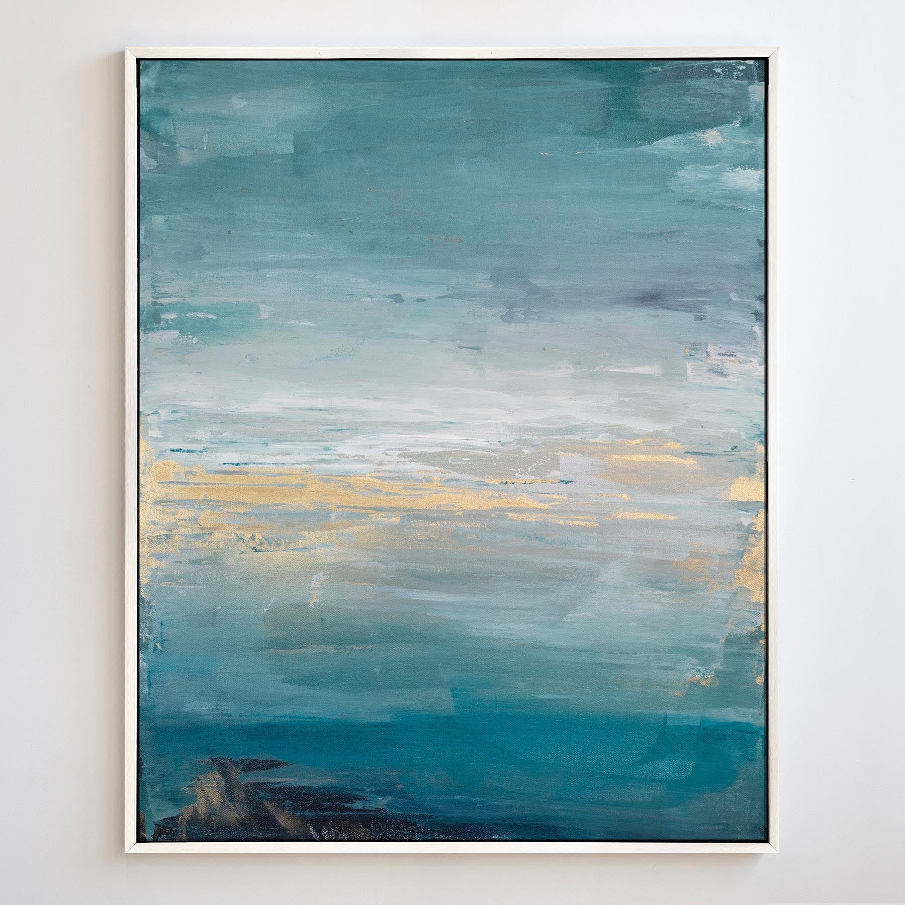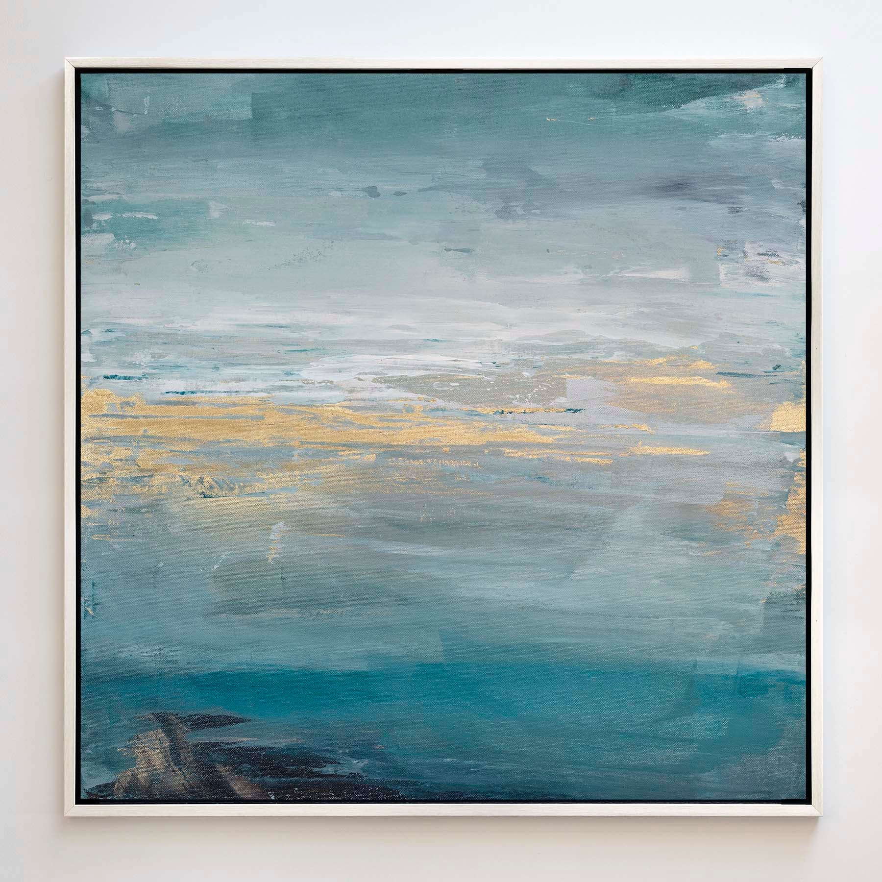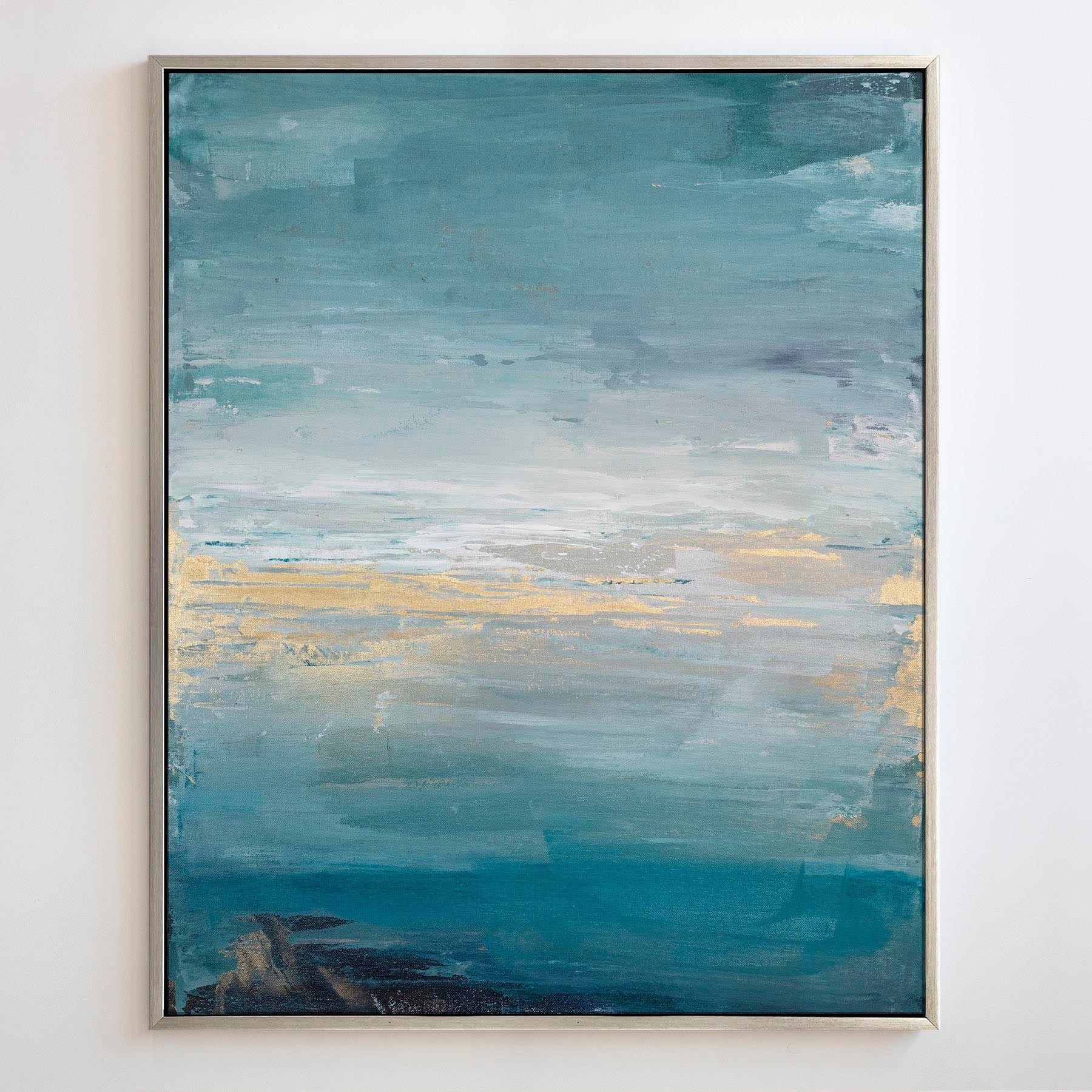 A coastal palette of teals, blues, soft white and gold delivers a rich feel to this canvas print.