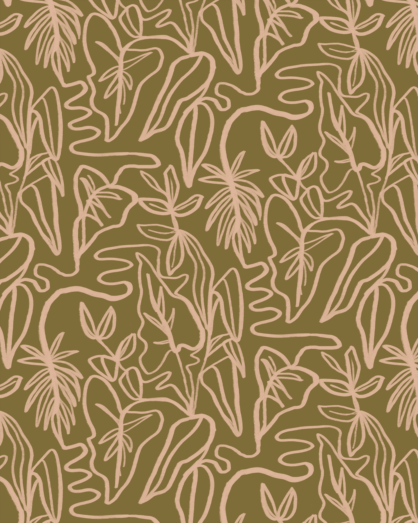 Inked Foliage Wallpaper, olive green and peach