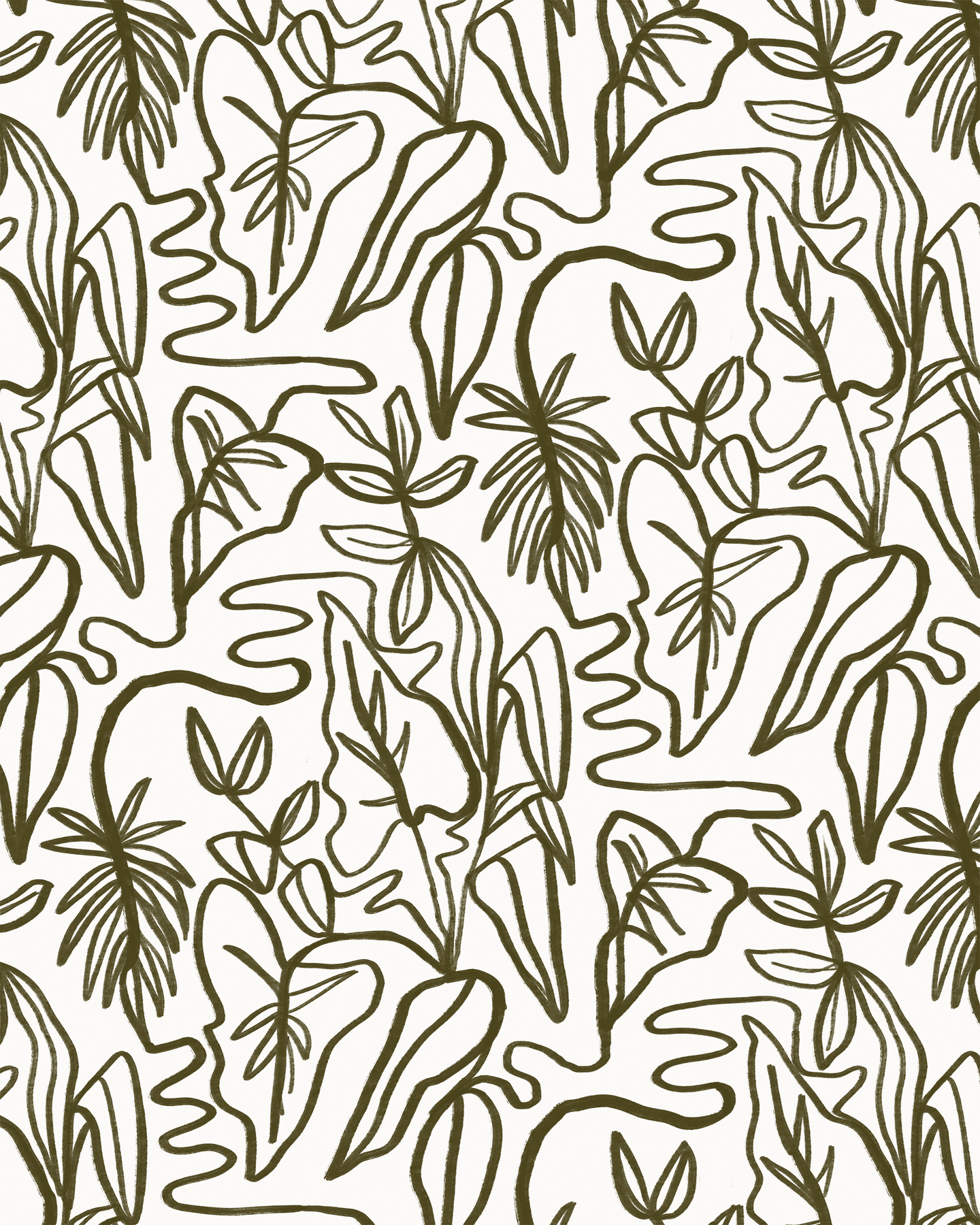 Revamp your living space with Inked Foliage Wallpaper in white and olive green. This stunning abstract botanical design, by Samantha Santana, adds an artistic touch to any room. With both peel and stick and traditional options, installation is a breeze. And when you're ready for a change, it's easy to remove. Transform your home today!