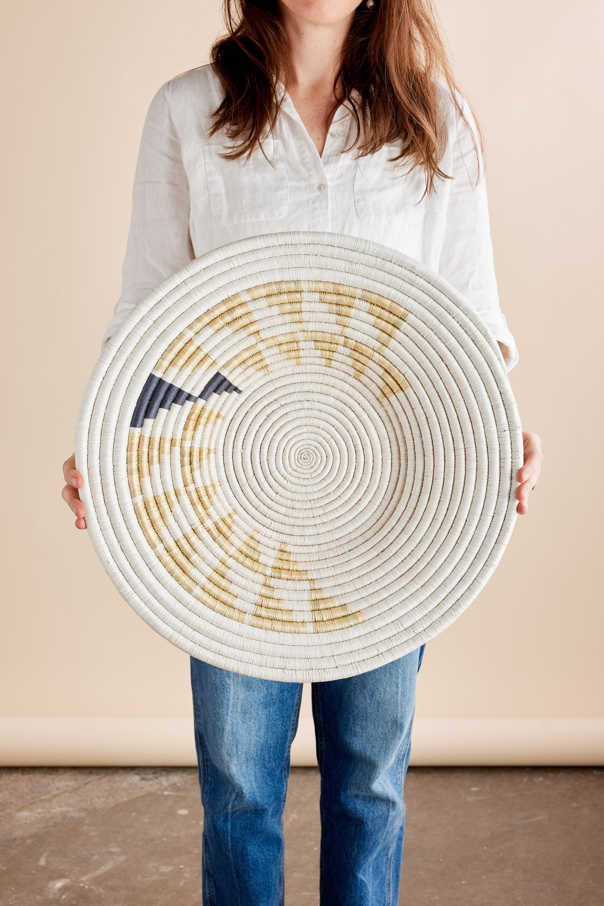 Transform your space with the exquisite craftsmanship of the Inyabu Wall Basket, a unique piece created by WomenCraft artisans for MADE51, a global brand of refugee-made products. The basket is crafted from upcycled "Gunia" grain sacks and colored sewing thread, intricately woven into natural grasses. Each piece is shaped like a shallow bowl and comes with a hanger on the back for easy wall mounting. The intricate weaving techniques have been passed down through generations, making each basket a masterpiece that takes several days to complete.