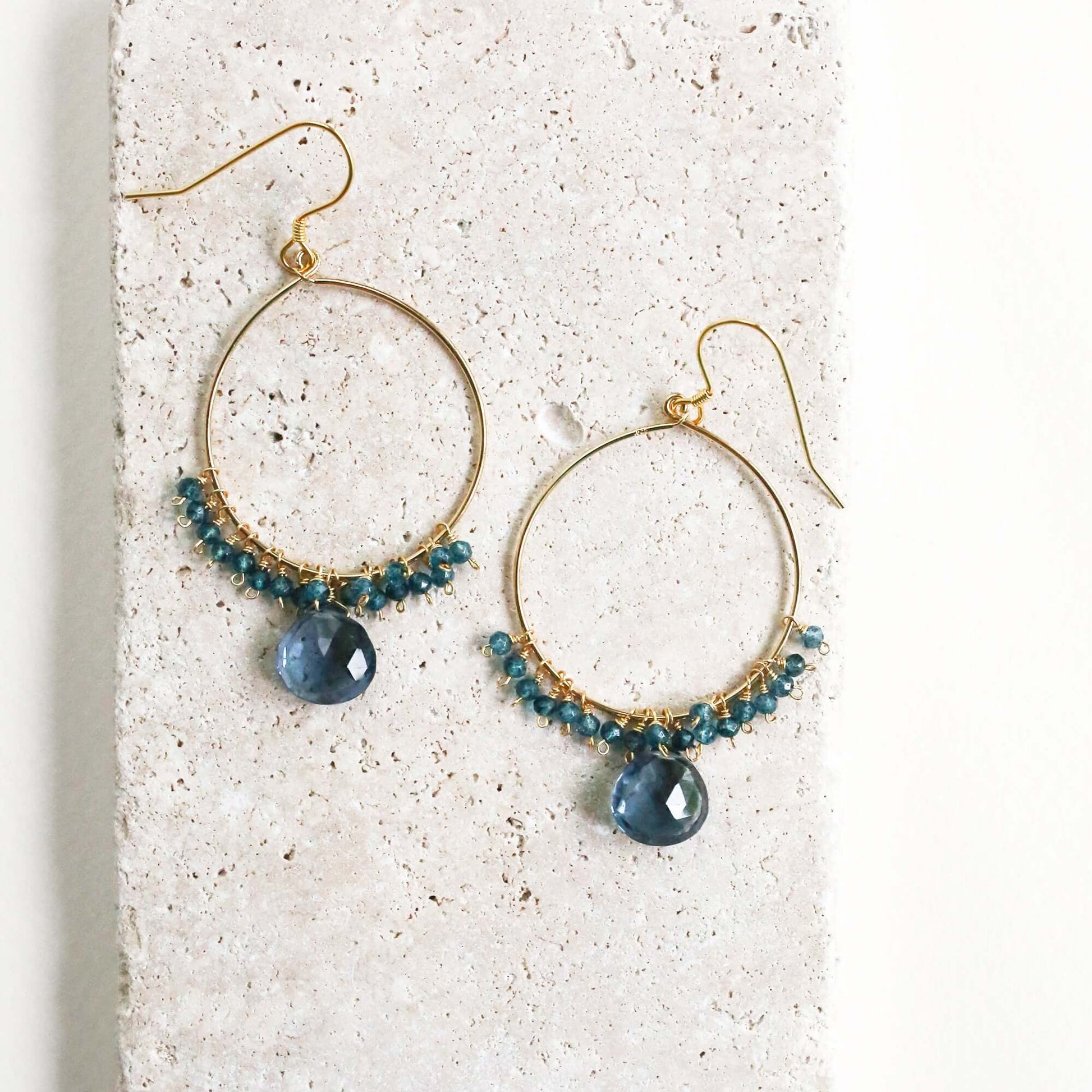 Bring a graceful sparkle to any look with our unique Iolite Swing Earrings. Featuring delicate (and extra lightweight) handmade gold hoops made of 14k gold plated over fine .925 Italian silver. Your stunning new earrings are 2.5" long.