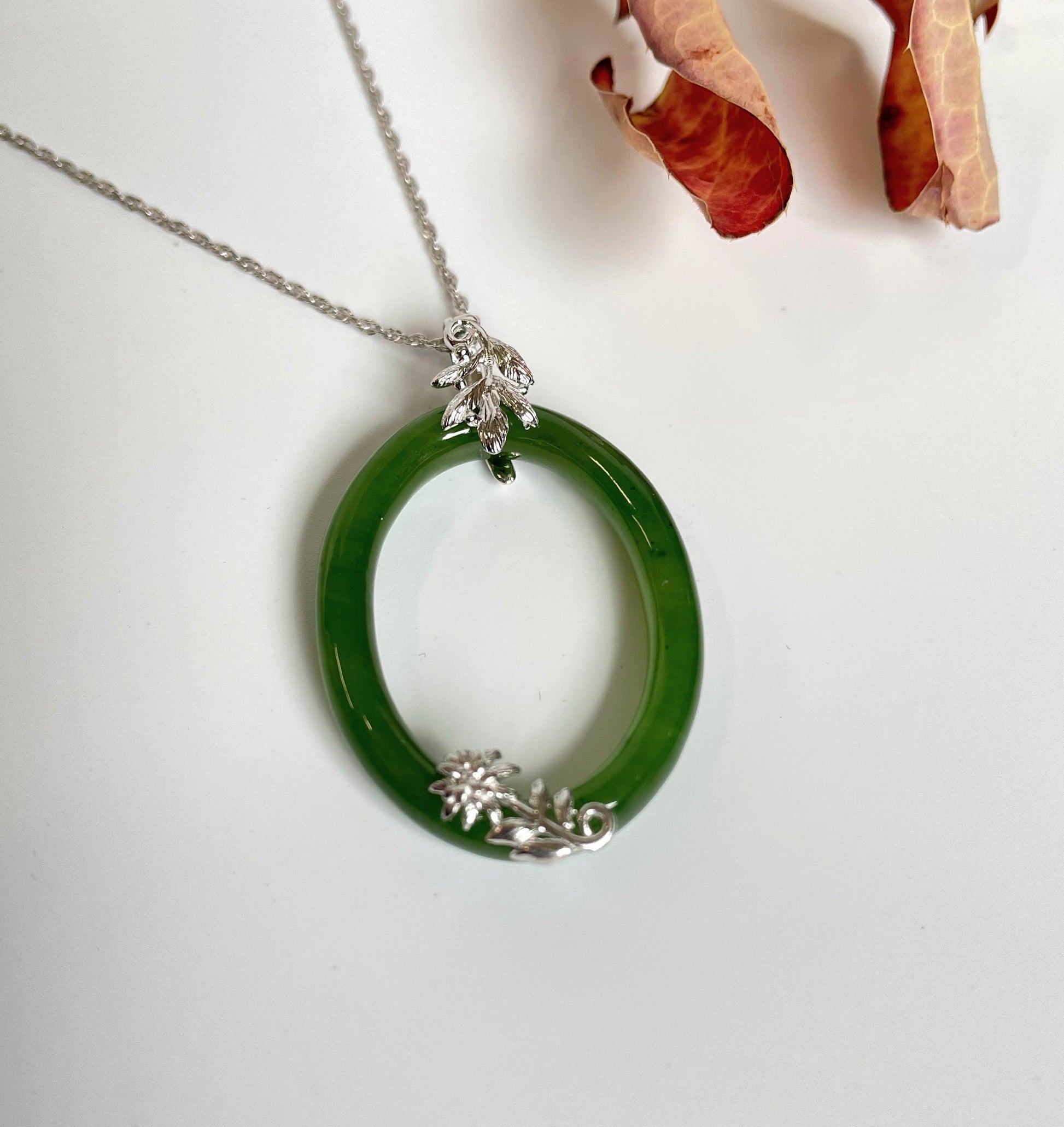 Canadian Nephrite Jade Oval Pendant, set with sterling silver leaves and a flower.