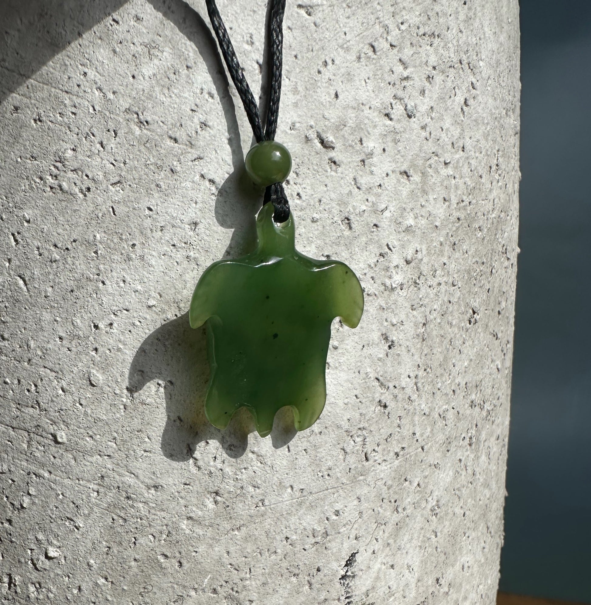 Hand Carved Canadian Nephrite Jade Turtle with abalone inlaid into the jade.