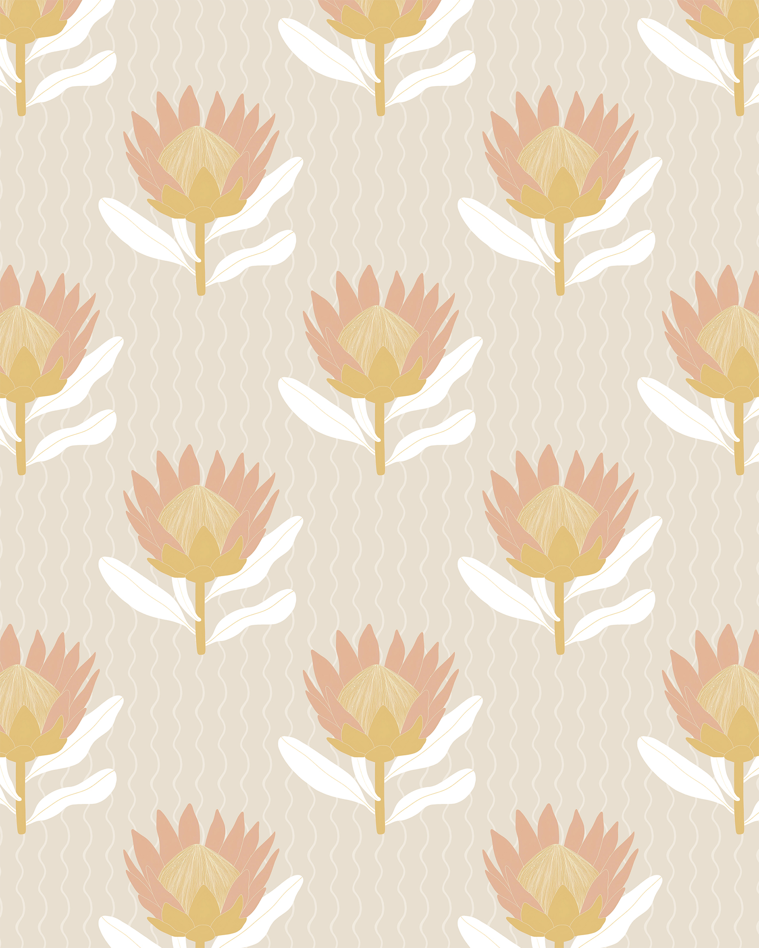 Introducing our King Protea Wallpaper, designed by Samantha Santana. This stunning design showcases the majestic king protea flower in a modern block print style, accented with stylish wavy stripes. Made with high-quality materials, it's easy to install and remove, giving your space a fresh new look. Create a beautiful, artistic atmosphere in your home.