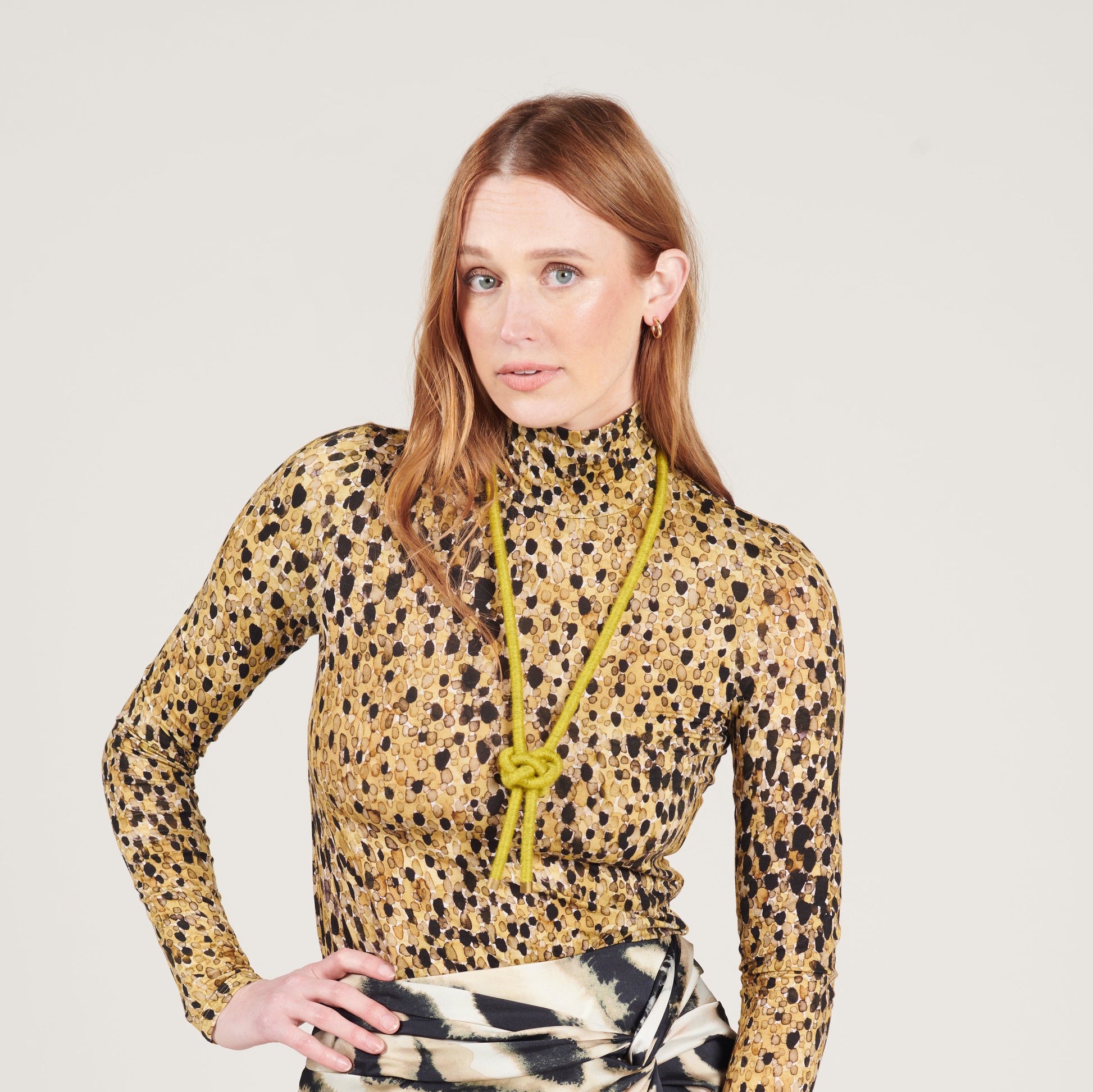 Lanyard knotted necklace with brass accents. A great option for those with metal sensitivities. Shown and modeled in Chartreuse Wool (not currently available).