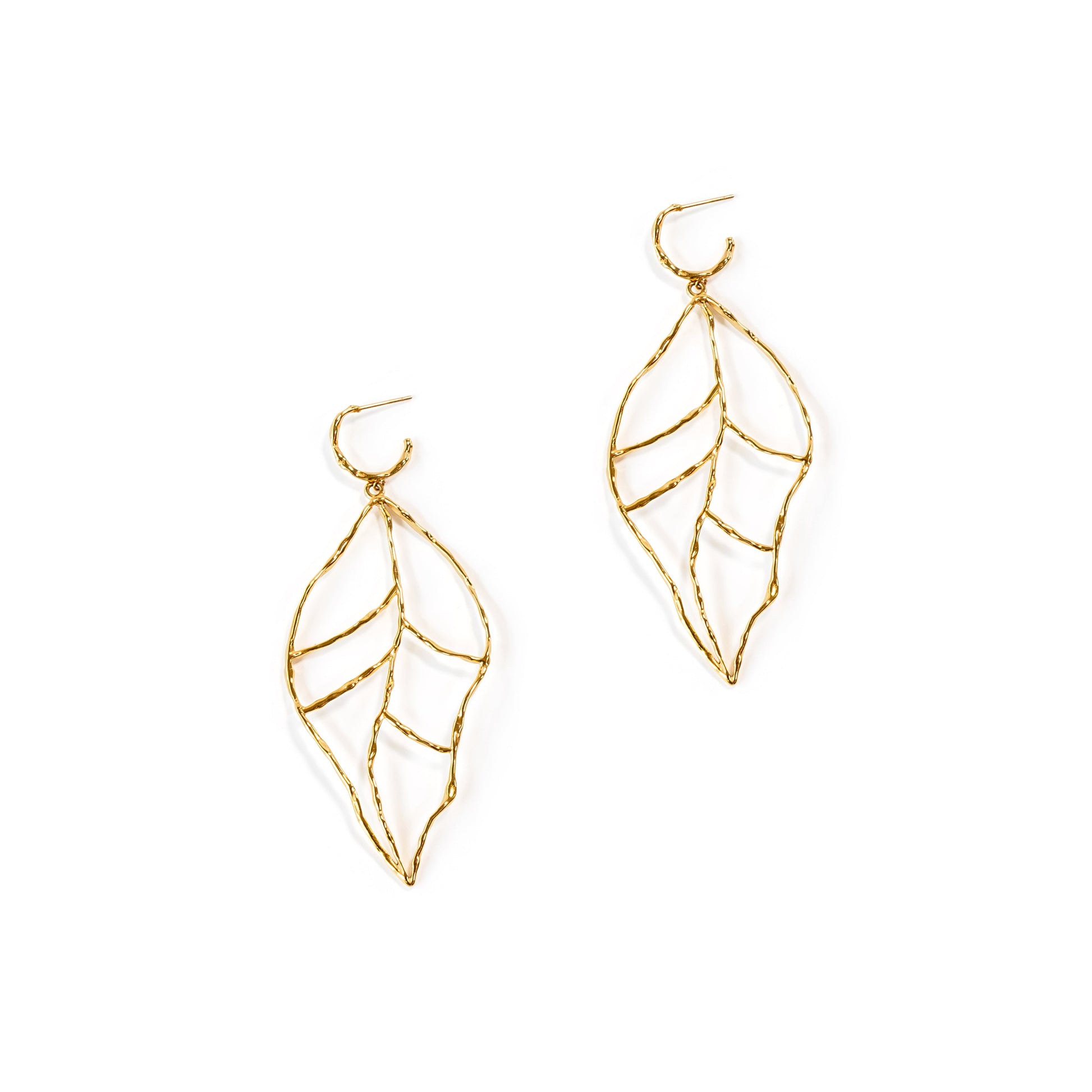 The Leaf of Learning Earrings are inspired by Eden's vocational training program which trains women in jewelry making, sewing, beauty therapy, and more. The 18K gold-plated leaf-shaped pendants are 3.5" by 1.5". They sit on 316 medical-grade hoop posts.