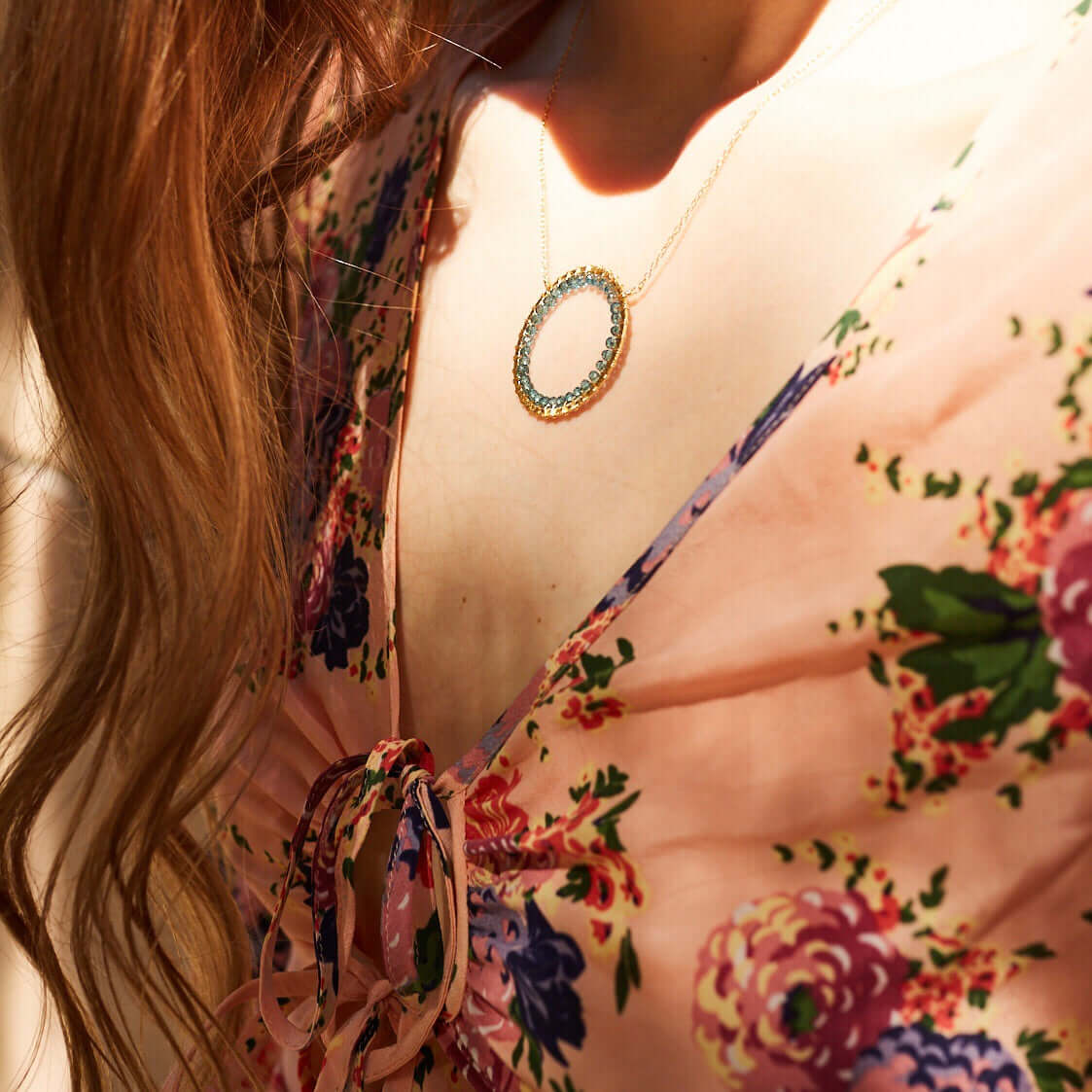 The Halo collection was our very first one. Intended to symbolize the intricate, universal energy woven within us all. This beautiful necklace is ultra lightweight and perfectly handmade featuring sparkling London Blue Quartz gems woven into our unique floating pendant design.