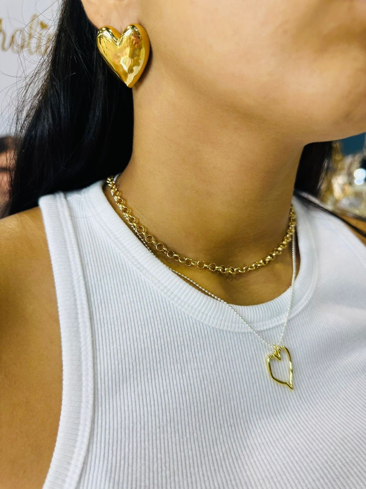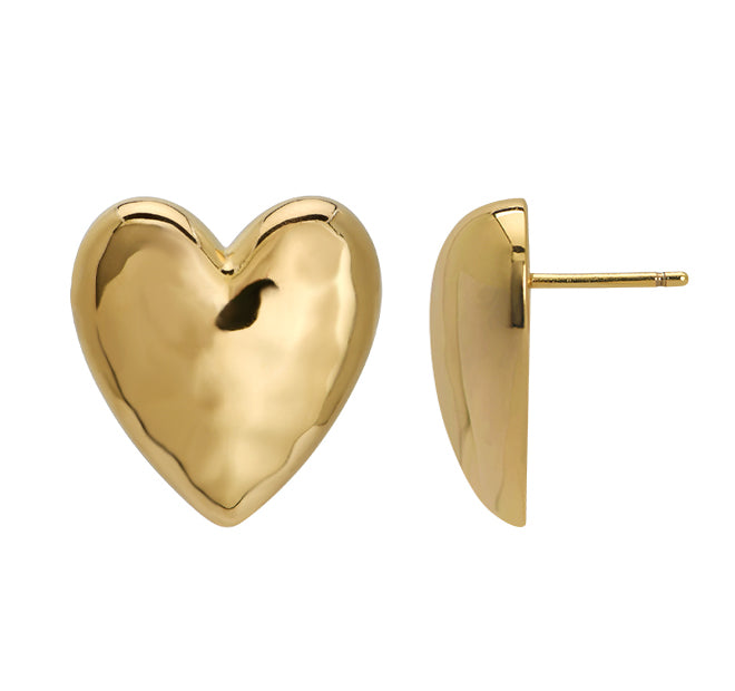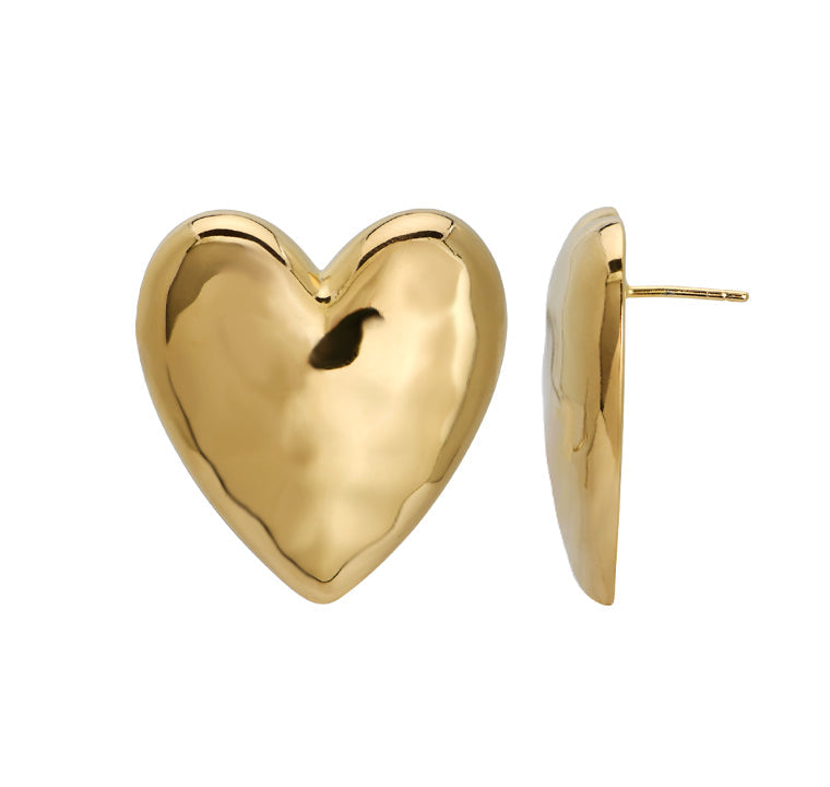 Introducing LUCIA, the ultimate statement earrings for the fashion-forward. Crafted with hypoallergenic 18k goldfilled material, the 30 mm dome puffed heart design features a unique slightly hammered texture. Elevate any outfit with these bold and elegant studs.