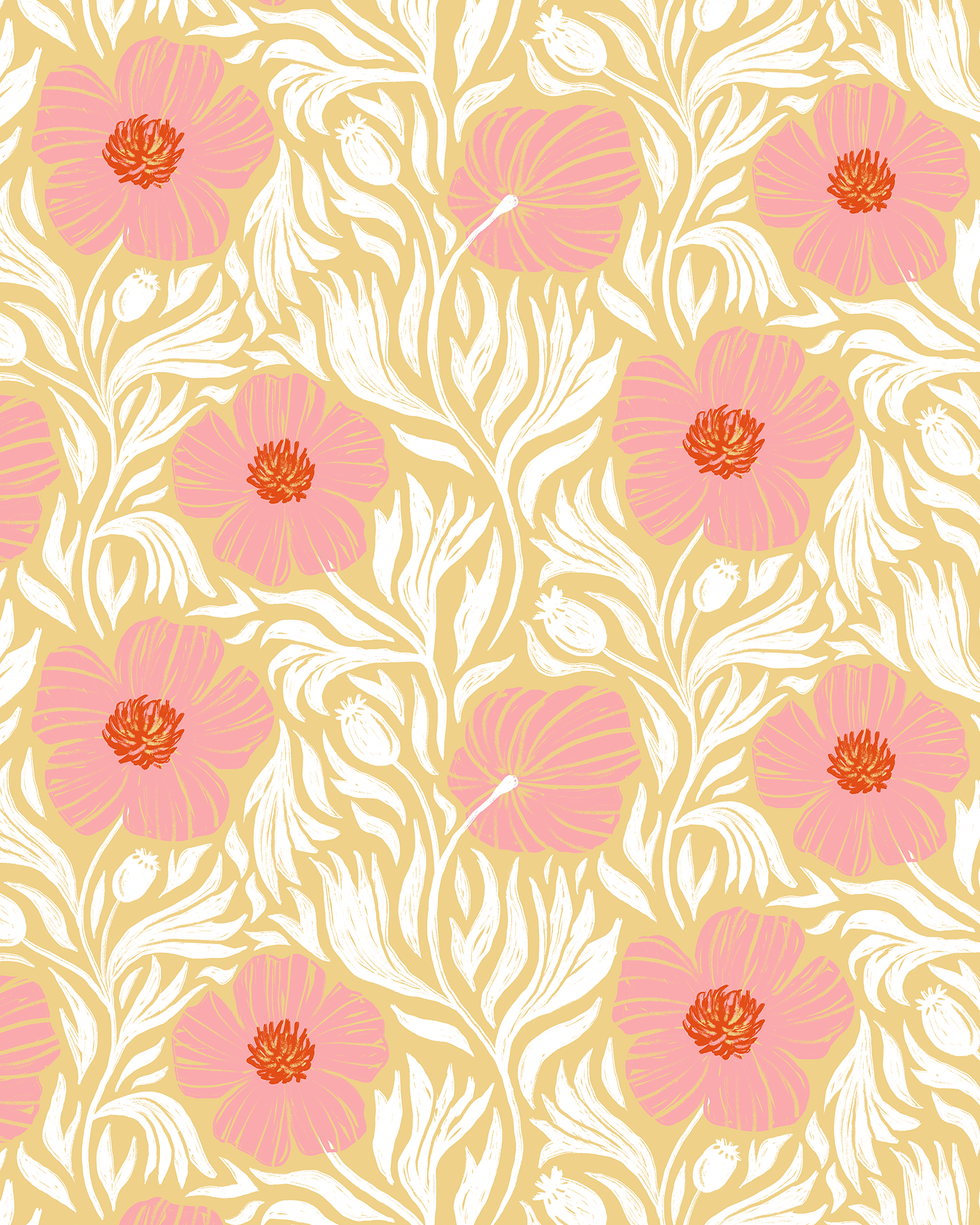 Matilija Wallpaper, butter yellow, pink & white