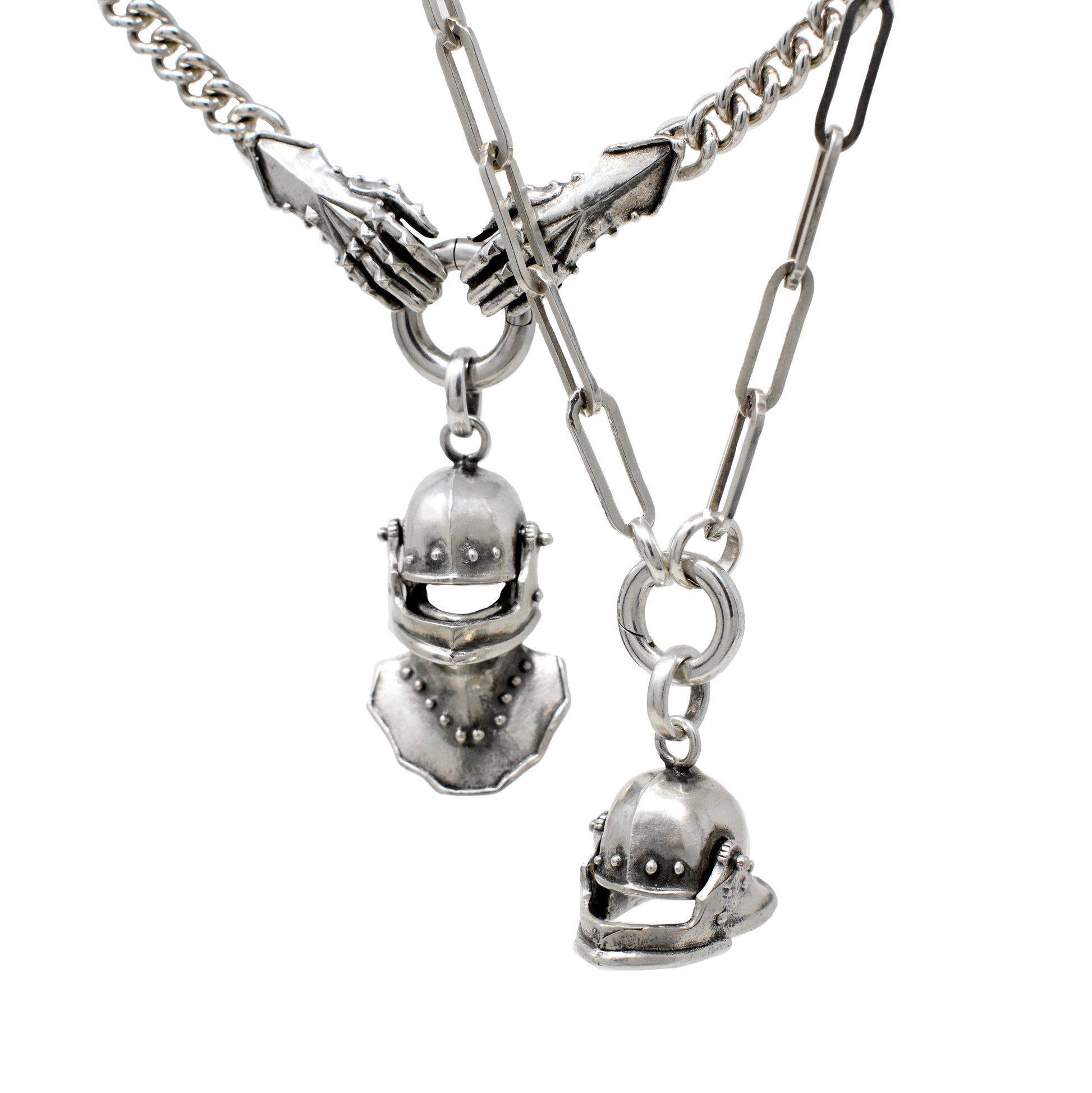 Modeled after historic 15th century armor, this stately pendant features a sallet and bevor inspired by Emperor Maximilian’s own, originally designed by Morgaine's favorite historical armorer, Lorenz Helmschmid. And yes, the visor lifts!