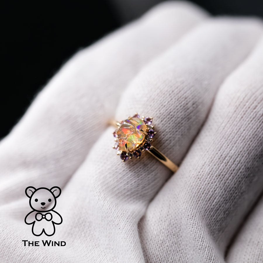 Mexican Fire Opal Amethyst Diamond Engagement Halo Ring 18K Yellow Gold.