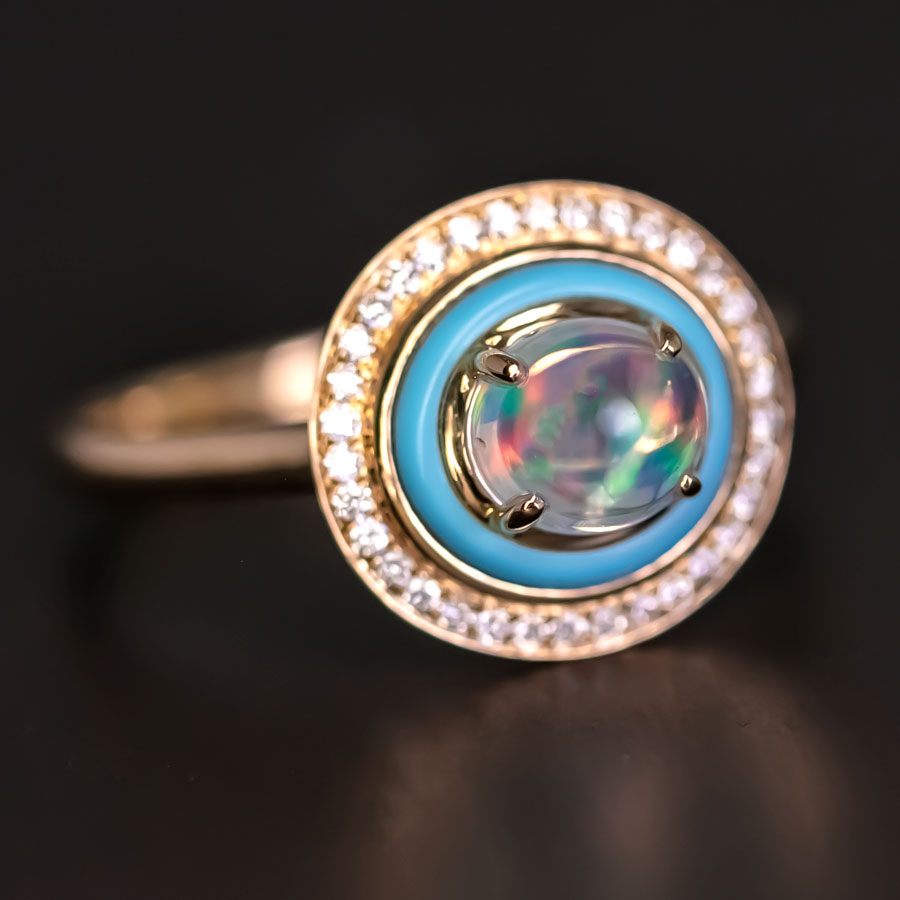 Mexican Fire Opal, Turquoise, Halo Diamond Engagement Ring in 18K Yellow Gold.