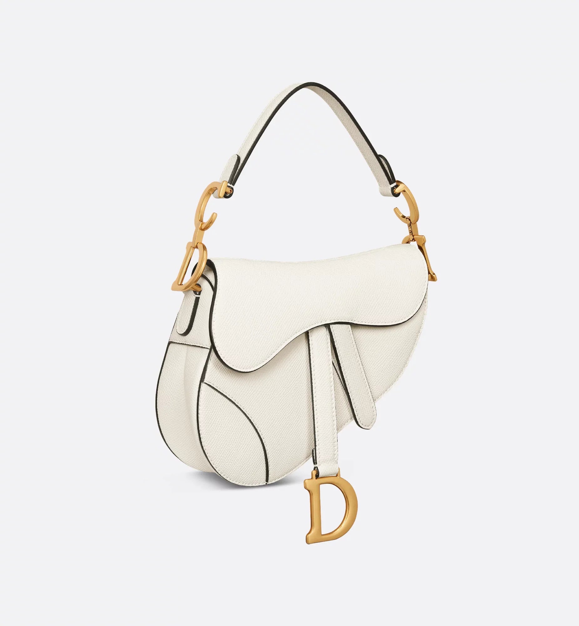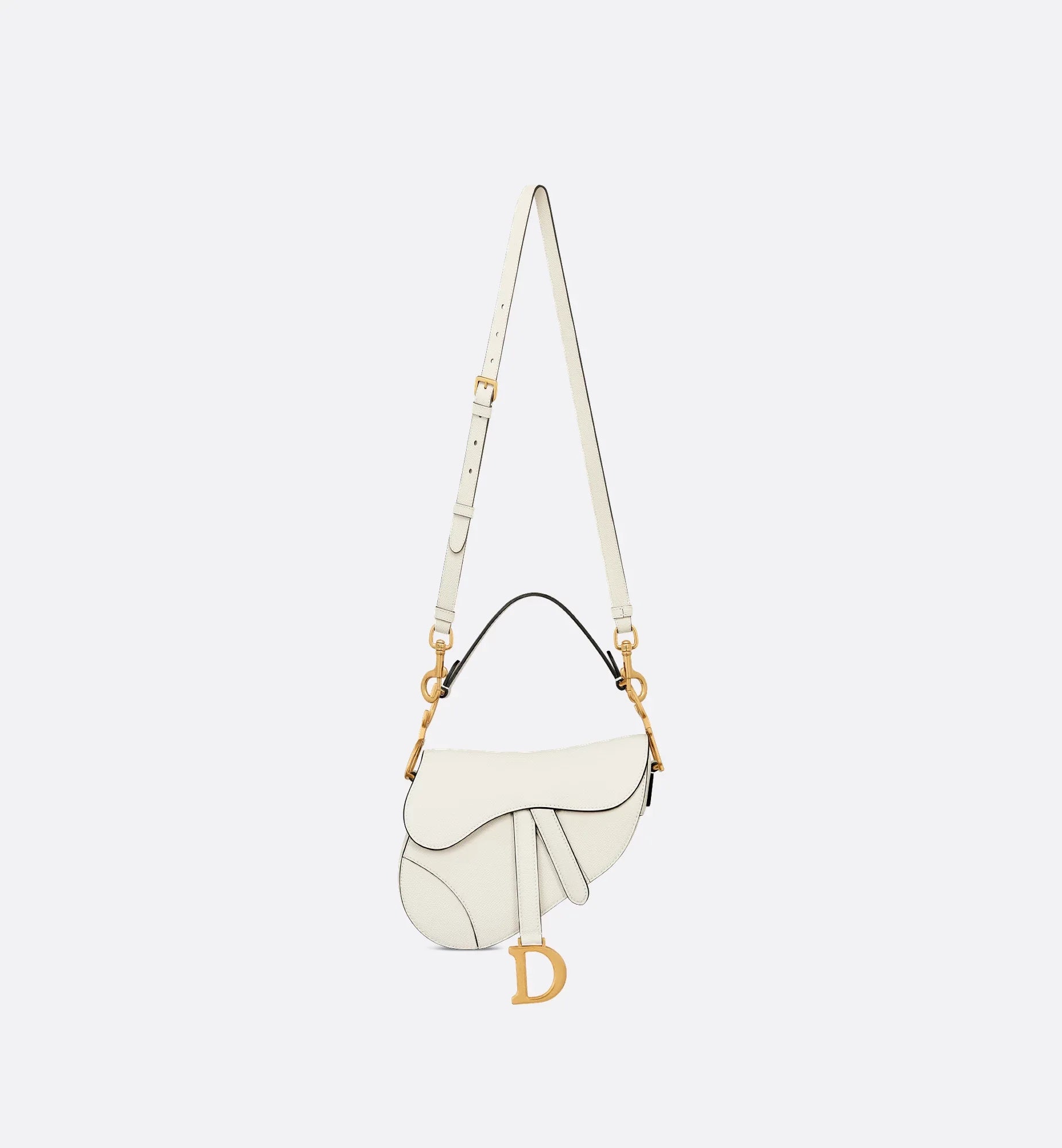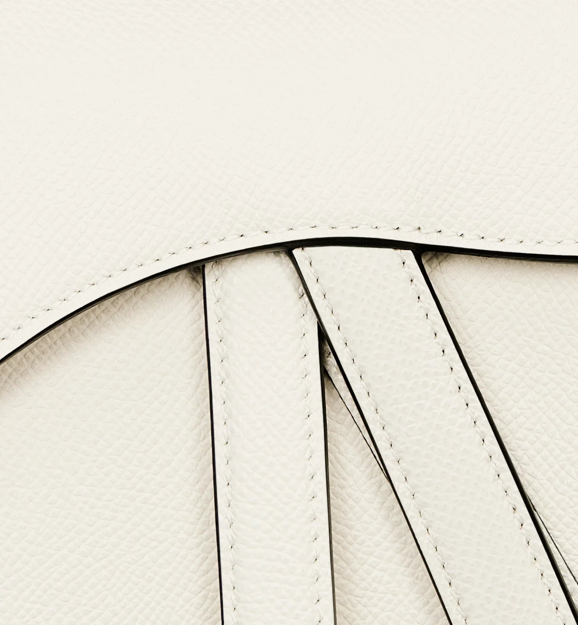 Maria Grazia Chiuri brings a fresh update to the iconic Saddle bag. Crafted in latte grained calfskin, the legendary design features a Saddle flap with a D stirrup strap and magnetic pull, as well as an antique gold-finish metal CD signature on either side of the top handle. Equipped with a thin, adjustable and removable strap, the miniature Saddle bag may be carried by hand, worn over the shoulder or crossbody.
