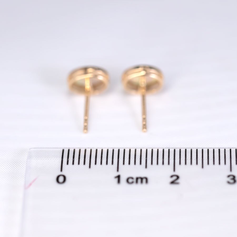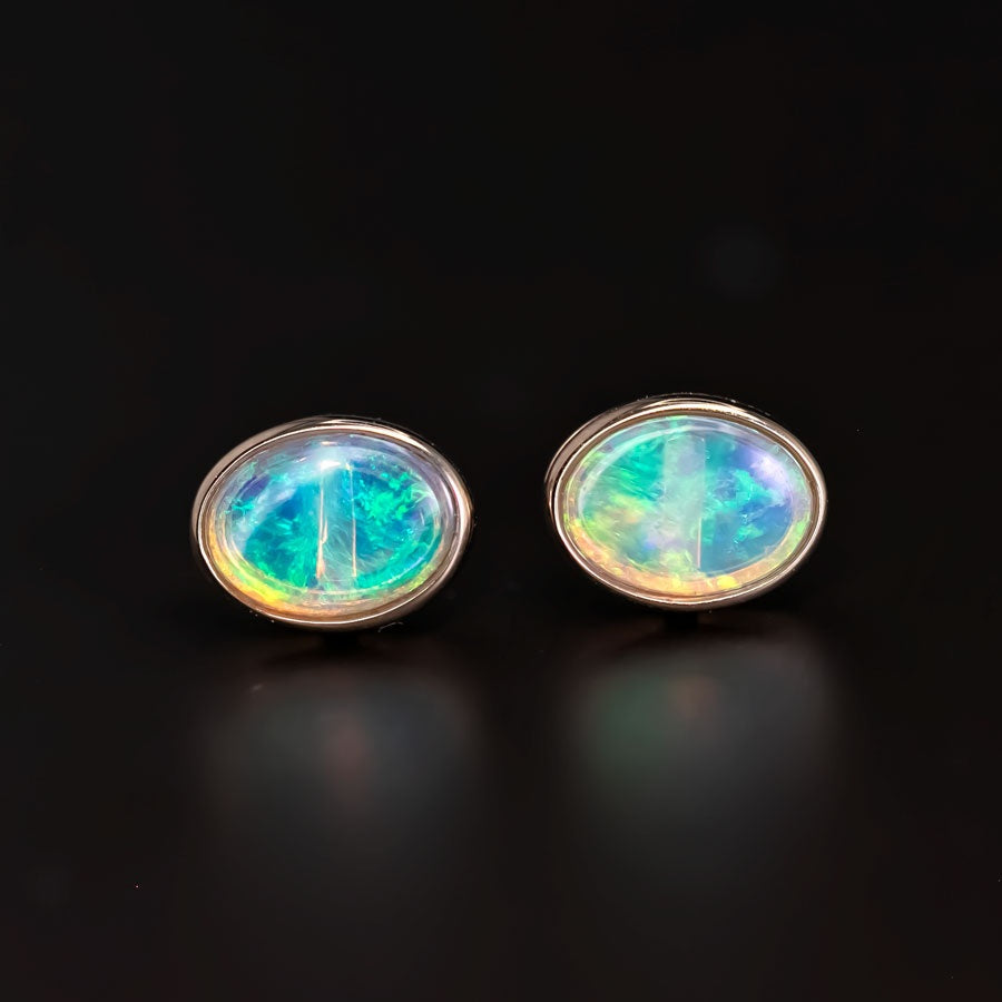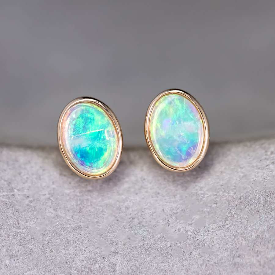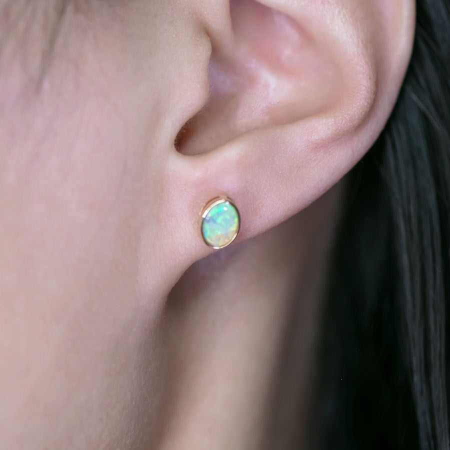 Minimalist Oval Australian Solid Opal Stud Earrings 14k Yellow Gold.