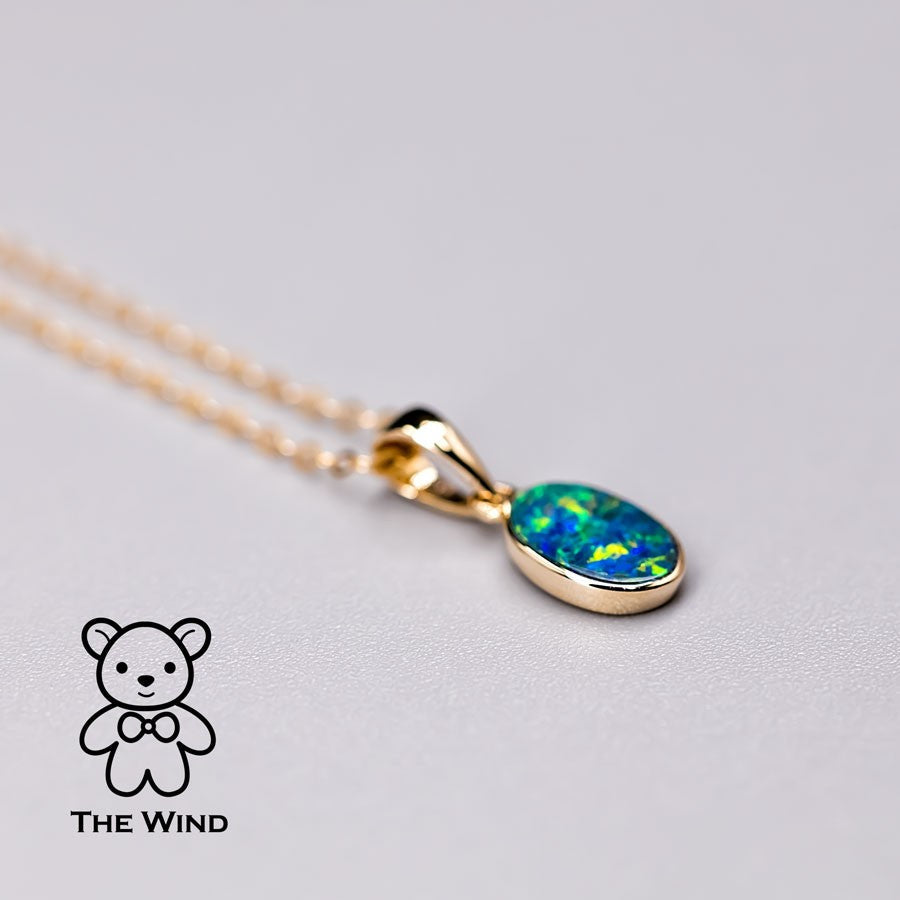 Minimalist Oval Natural Australian Doublet Opal Pendant Necklace 14k Yellow Gold.