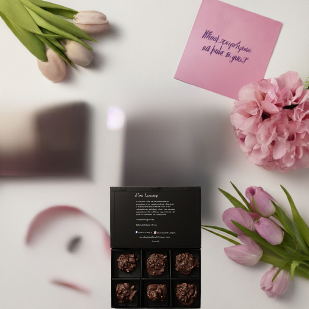 A luxurious blend of toasted pecans, decadent chocolate, condensed milk, pure cane sugar, vanilla, and a hint of espresso—our Mississippi Mudslide praline is rich, bold, and beautifully balanced. This individually wrapped 2 oz confection is where chocolate meets handcrafted tradition.