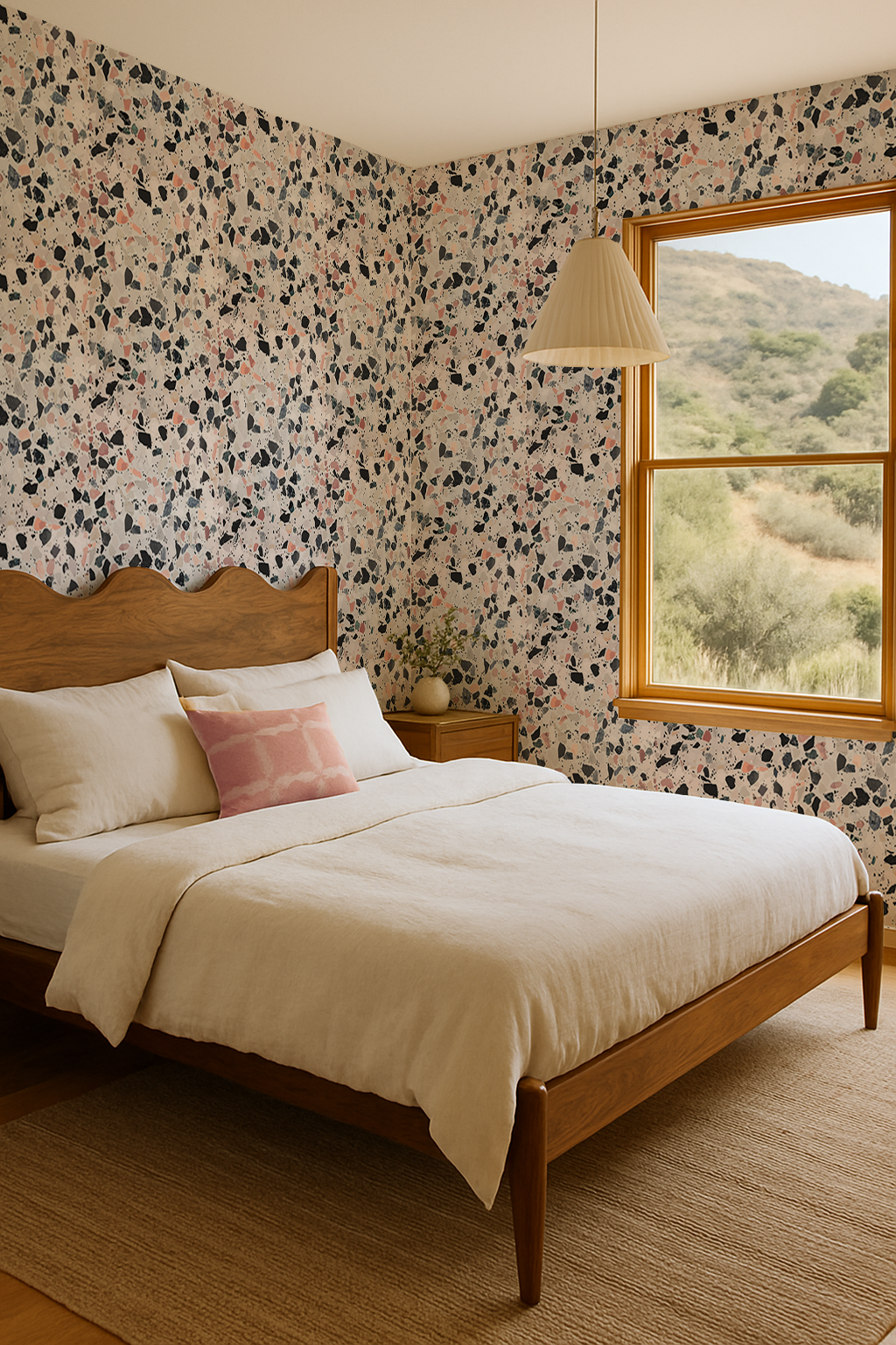 Introducing our luxurious Mojave Terrazzo Wallpaper, featuring stunning artwork by Samantha Santana. Inspired by Italian terrazzo, it's a stylish and affordable alternative that adds a touch of sophistication to any space. With both peel and stick vinyl and traditional pasted options, installation is hassle-free. And when you're ready for a change, it's easy to remove without any damage. Elevate your walls with this exclusive design today.