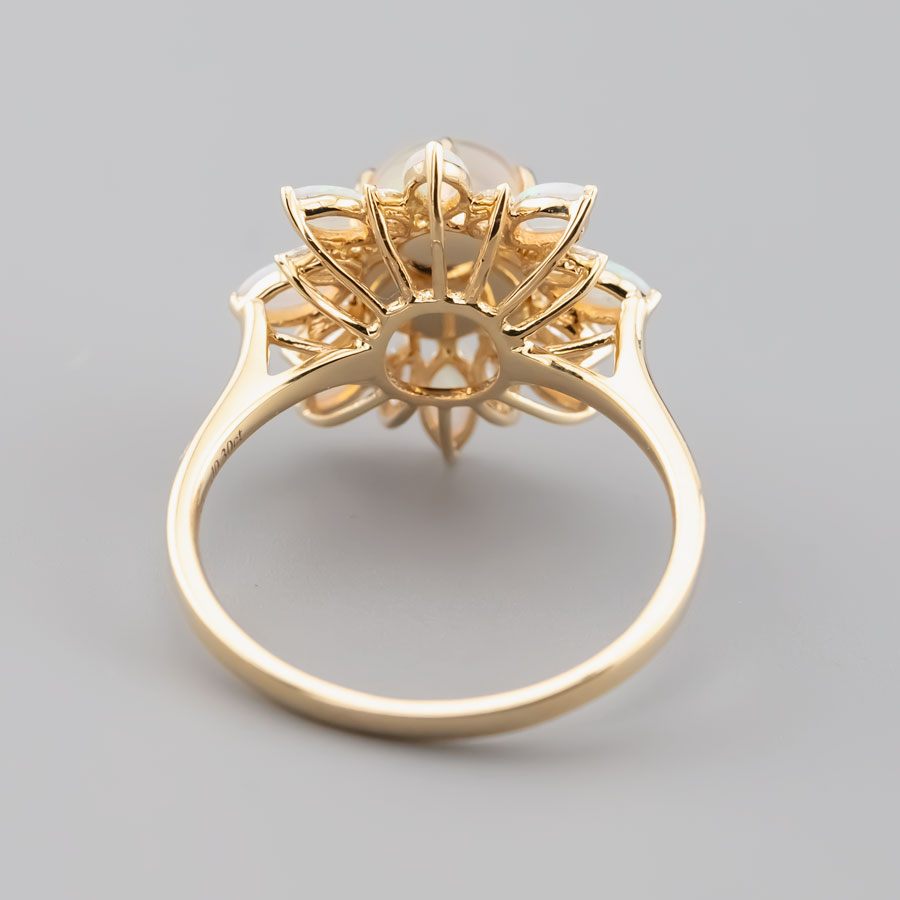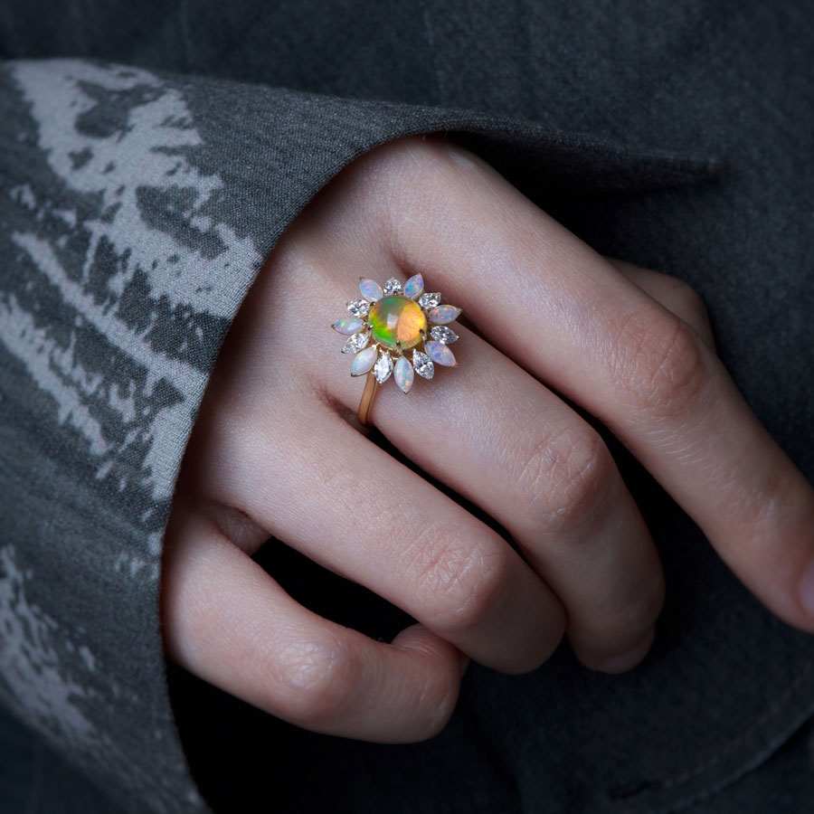 Design idea: "My Shining Star" ring sparkles with top-quality fire opals in vibrant rainbow hues, surrounded by eight marquise-cut diamonds and eight Australian crystal opals. The opals and diamonds encircle the center stone beautifully, creating a dazzling effect that radiates brilliance from every angle.