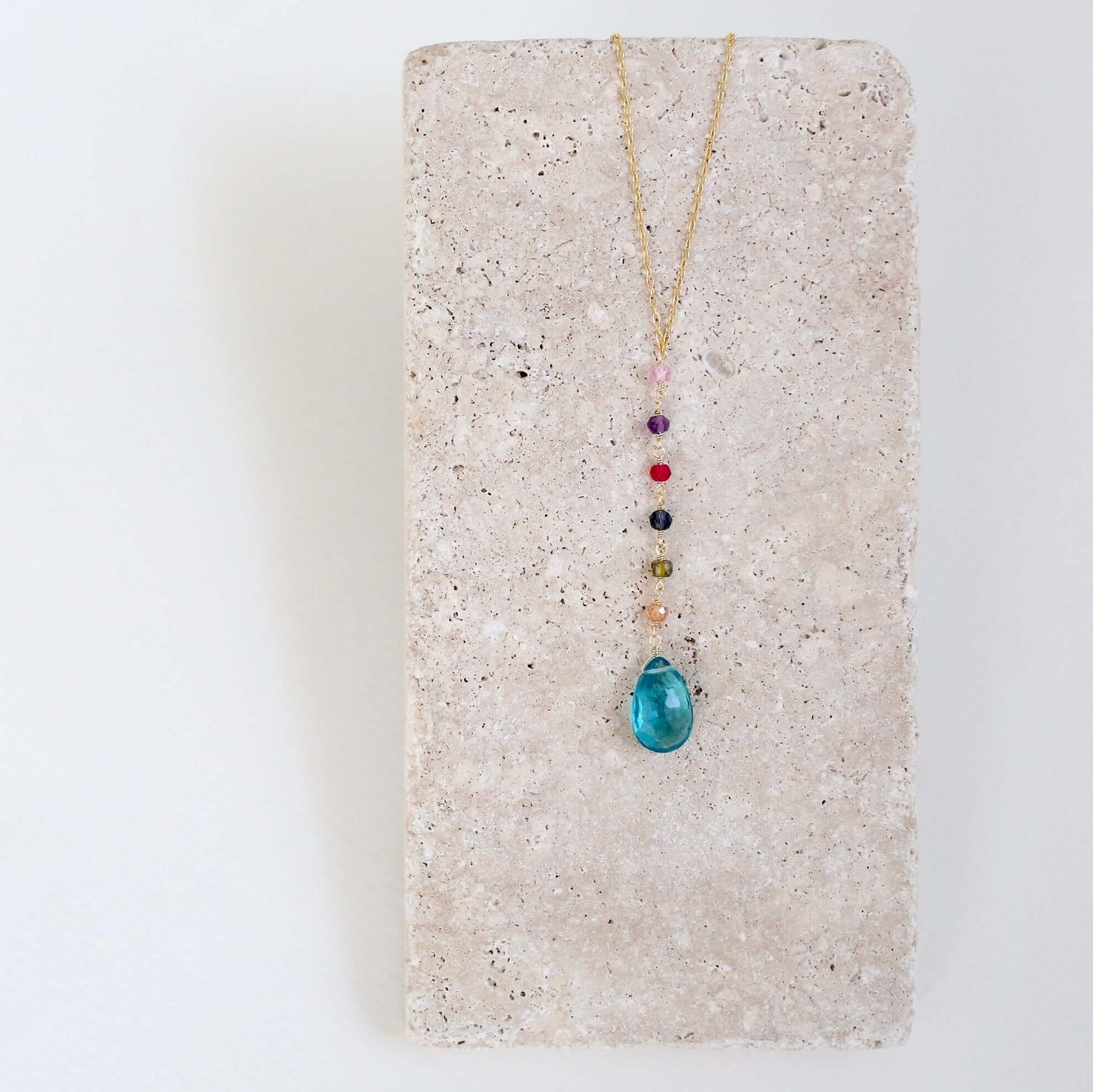 - Neon blue quartz gemstones paired with multi color gemstone accent stones- 18-20" long with a 2" extender chain