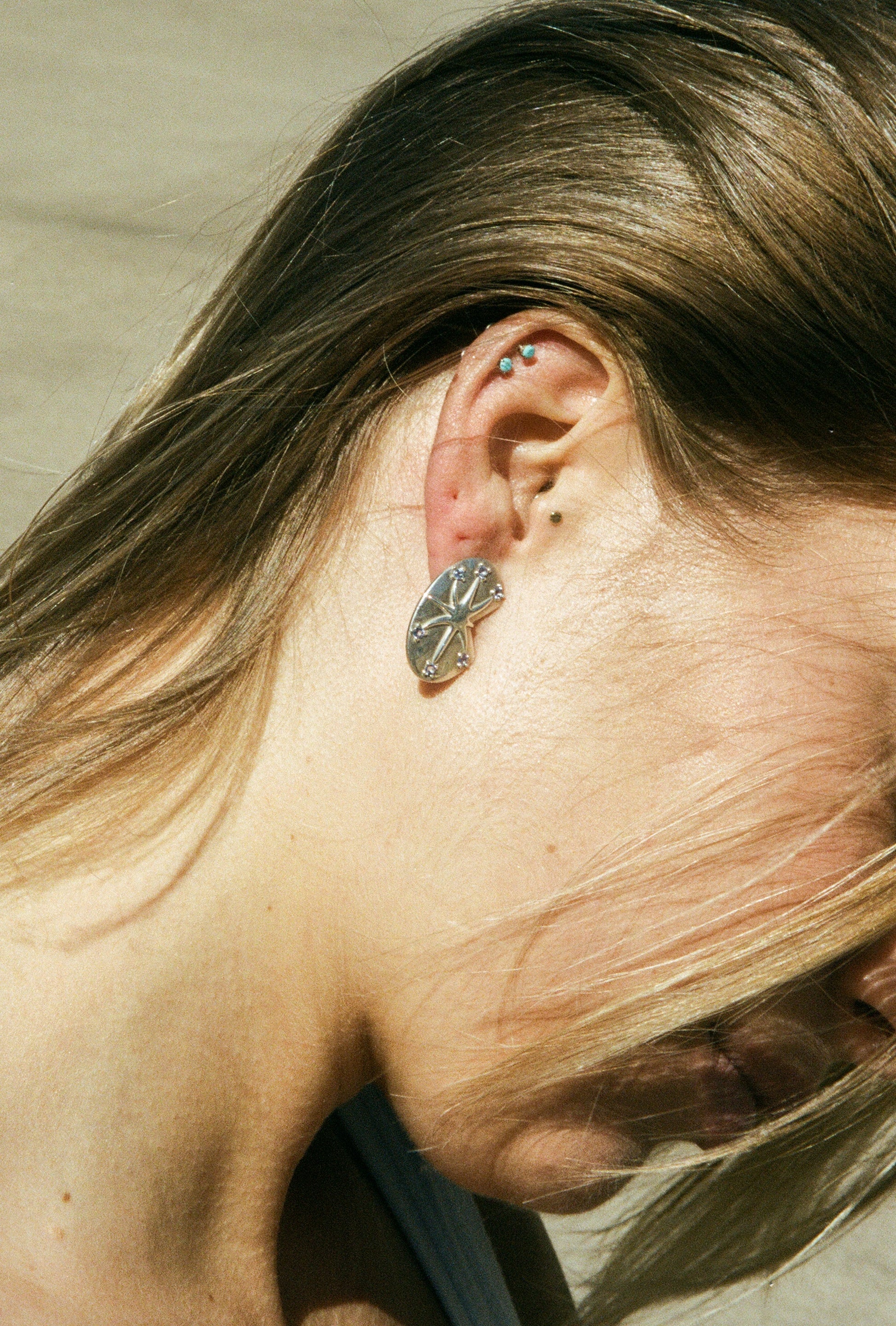 - Oval-shaped earring with cutout and leveled detailing