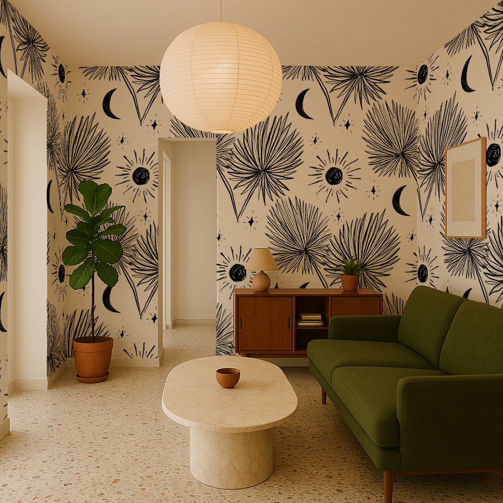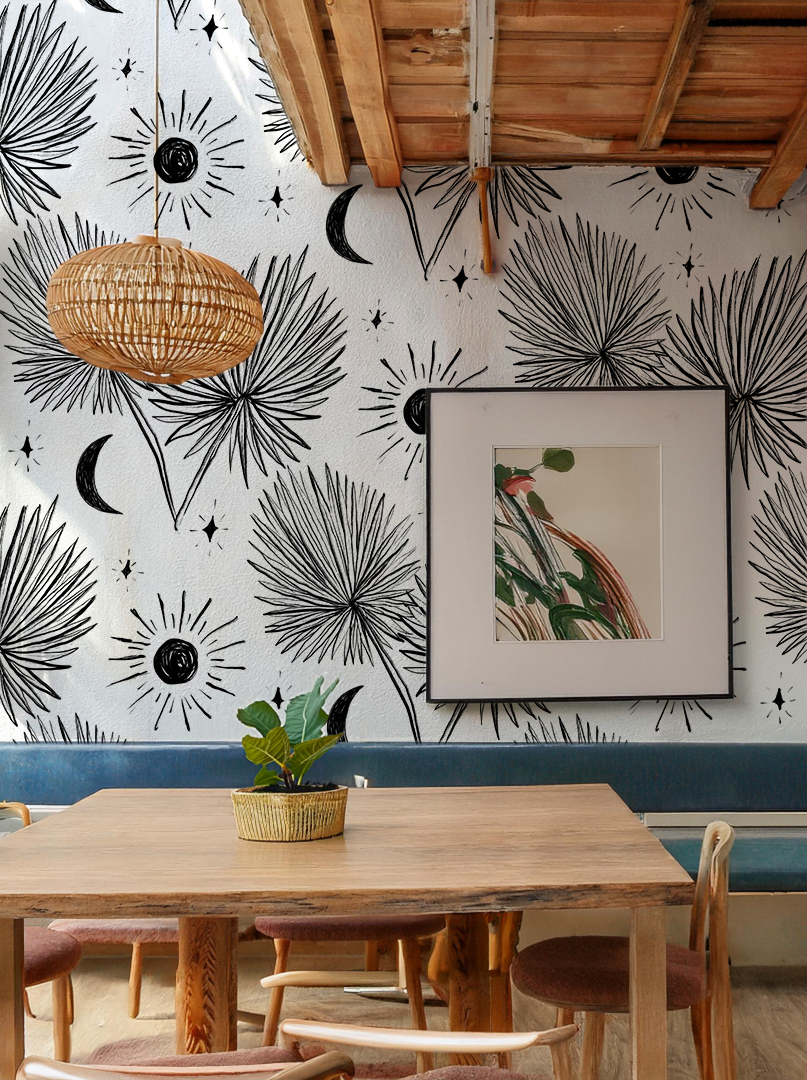Transform your space into a luxurious oasis with our Night Palm Wallpaper, featuring artwork by Samantha Santana. Inspired by starry summer nights, this wallpaper adds warmth and charm. Choose between easy peel and stick or smooth traditional paste installation. And it's removable - perfect for a sophisticated and ever-changing aesthetic.