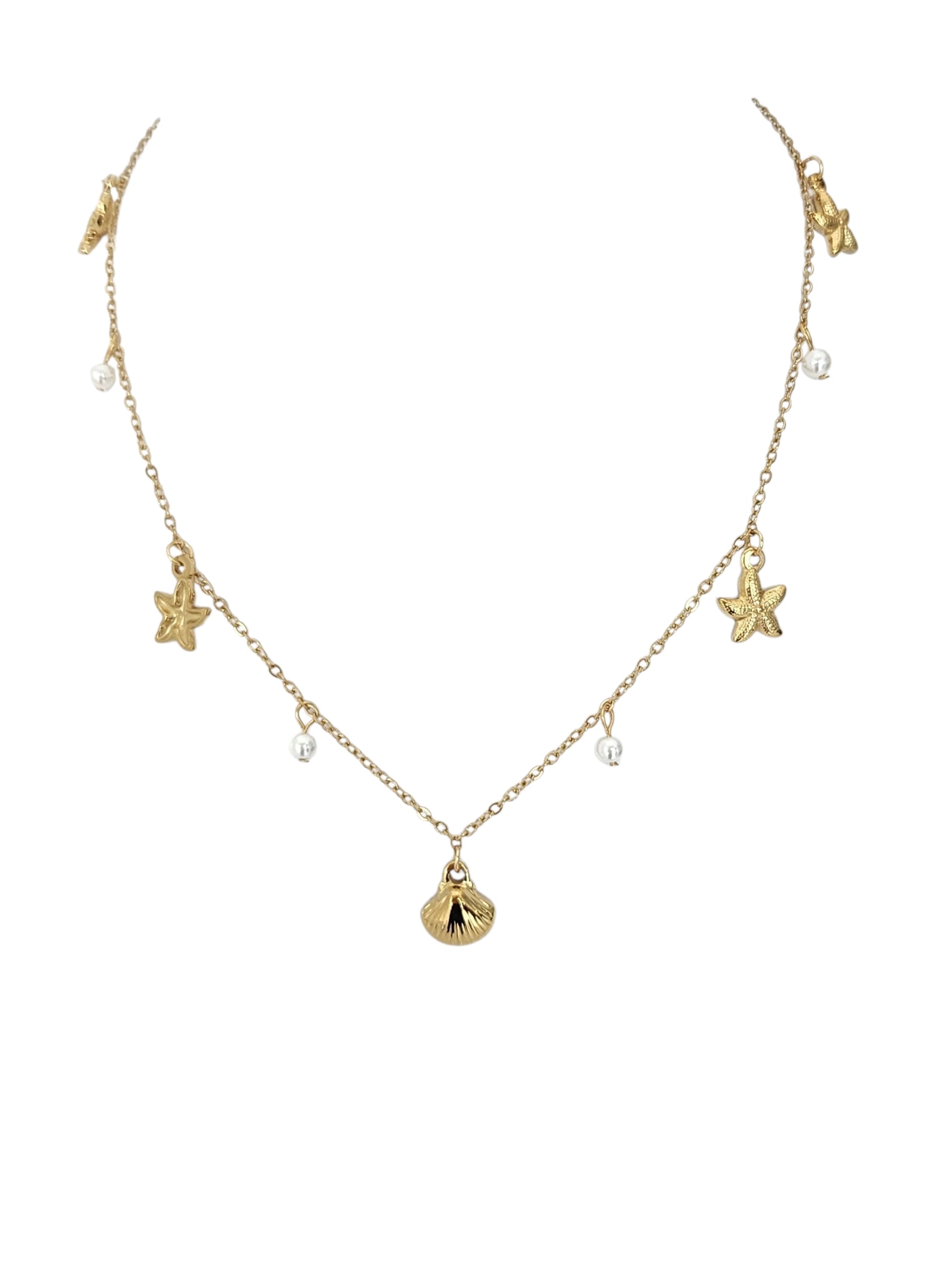 Elevate your summer style with the OASIS DROP choker, featuring delicate sea star and shell charms crafted from hypoallergenic 316 stainless steel. Measuring 16" with a 2" extender, it offers a perfect fit for all-day comfort. Durable and resistant to tarnish, this necklace brings a touch of ocean-inspired elegance to any outfit.