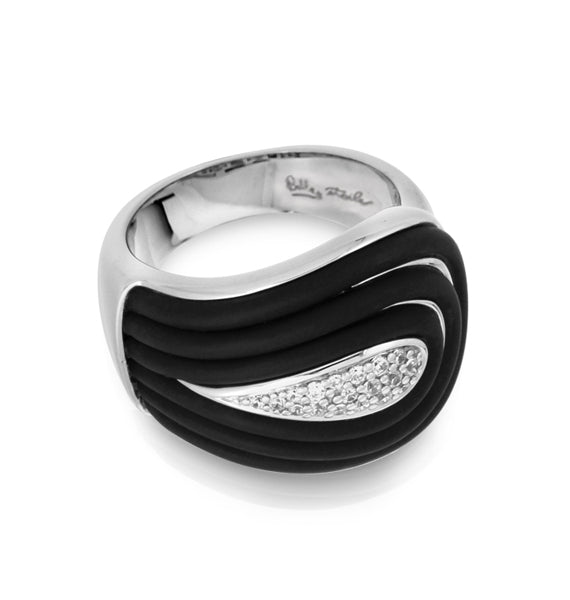 Description: Black Italian rubber with framed champagne pave-set stones set into rhodium-plated, nickel allergy-free, 925 sterling silver.